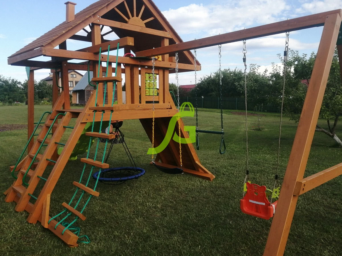 Усиленная детская площадка Премиум класса изготовлена из качественной древесины, поэтому безопасна для нежного здоровья детей. Углы сглажены, большая крыша не пропускает сильные лучи солнца, защищая детей от солнечного удара.