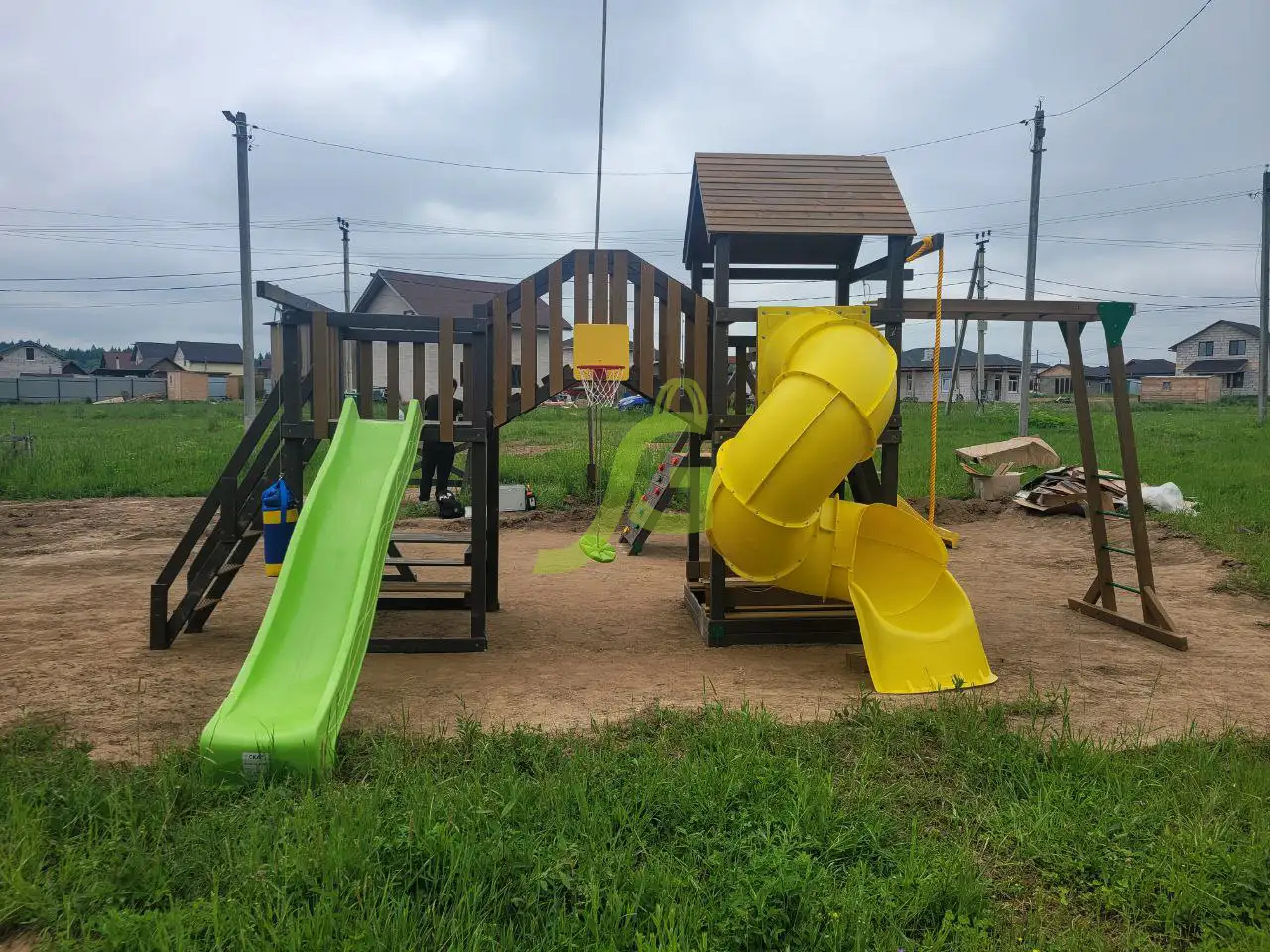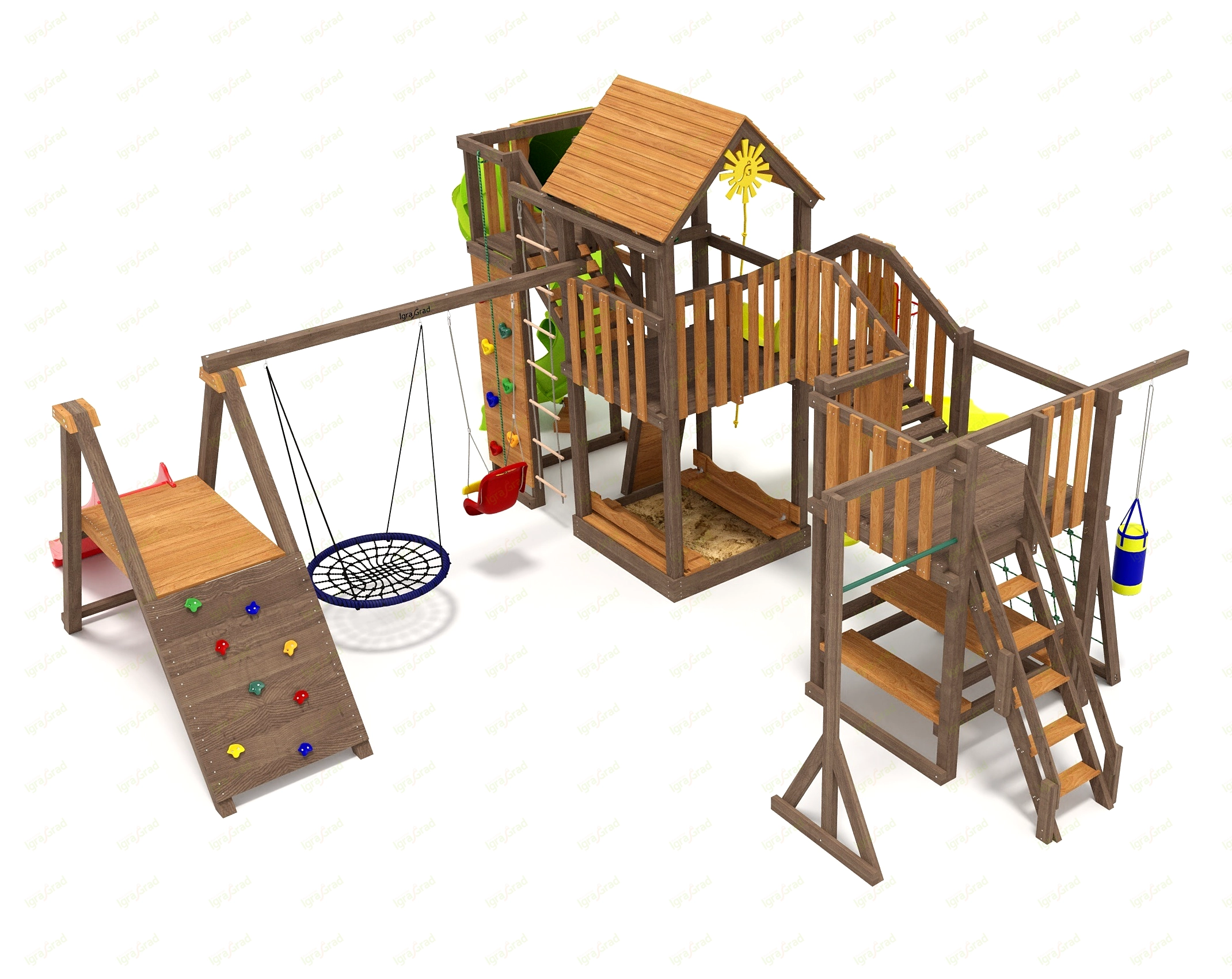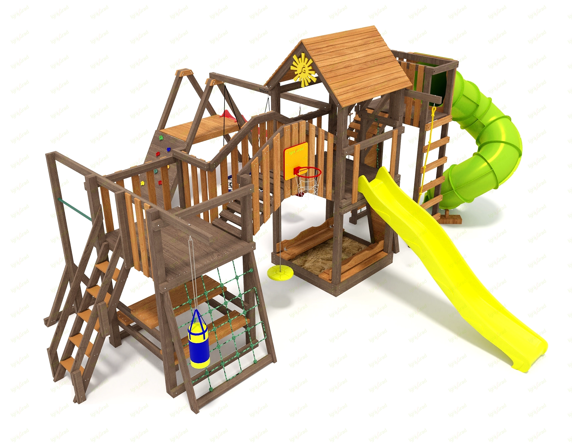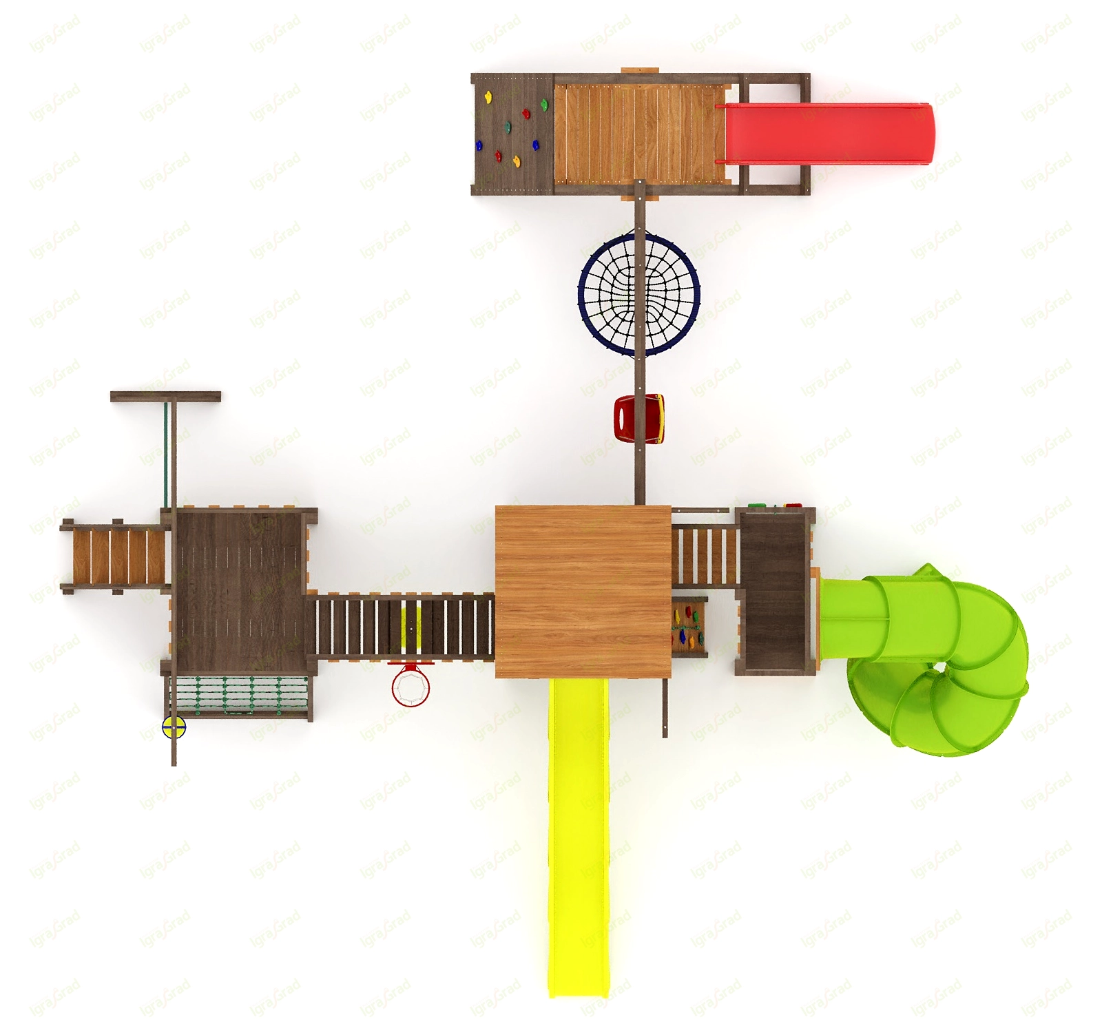 Здесь есть всё, что нужно маленькому искателю приключений: две башени, связанные мостом, словно приглашают подняться на вершину и исследовать новые горизонты. Скалодром, с разноцветными камнями это тренировка в ловкости и смелости, а баскетбольное кольцо поможет отточить меткость.