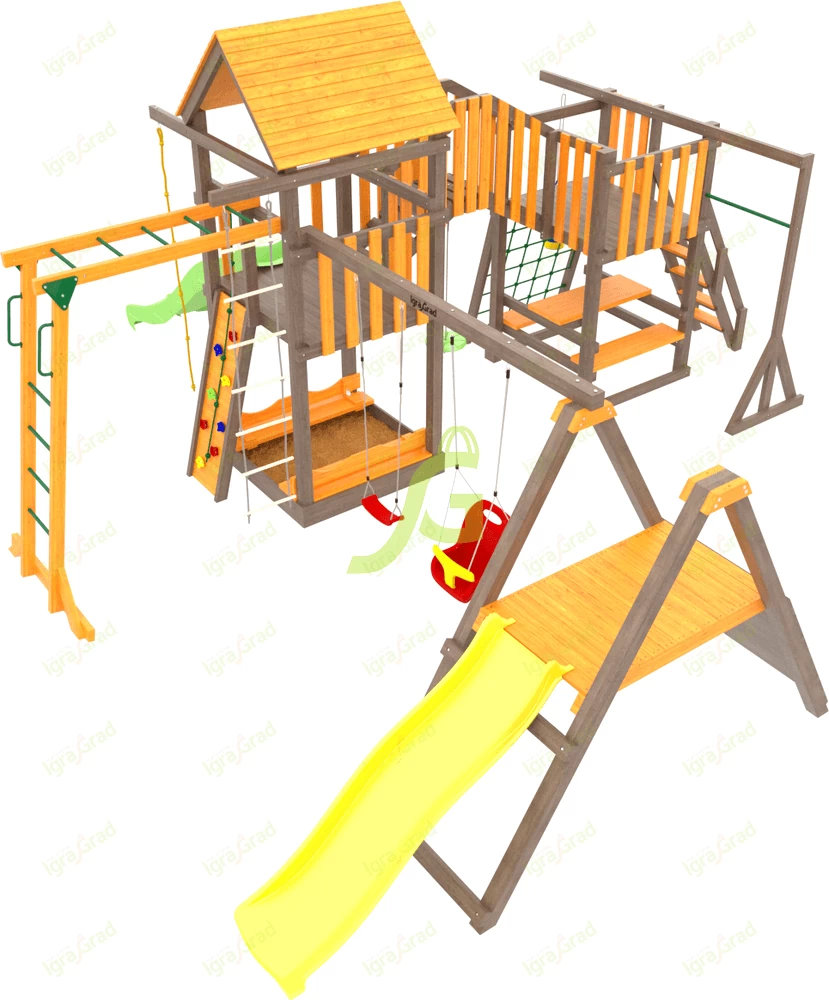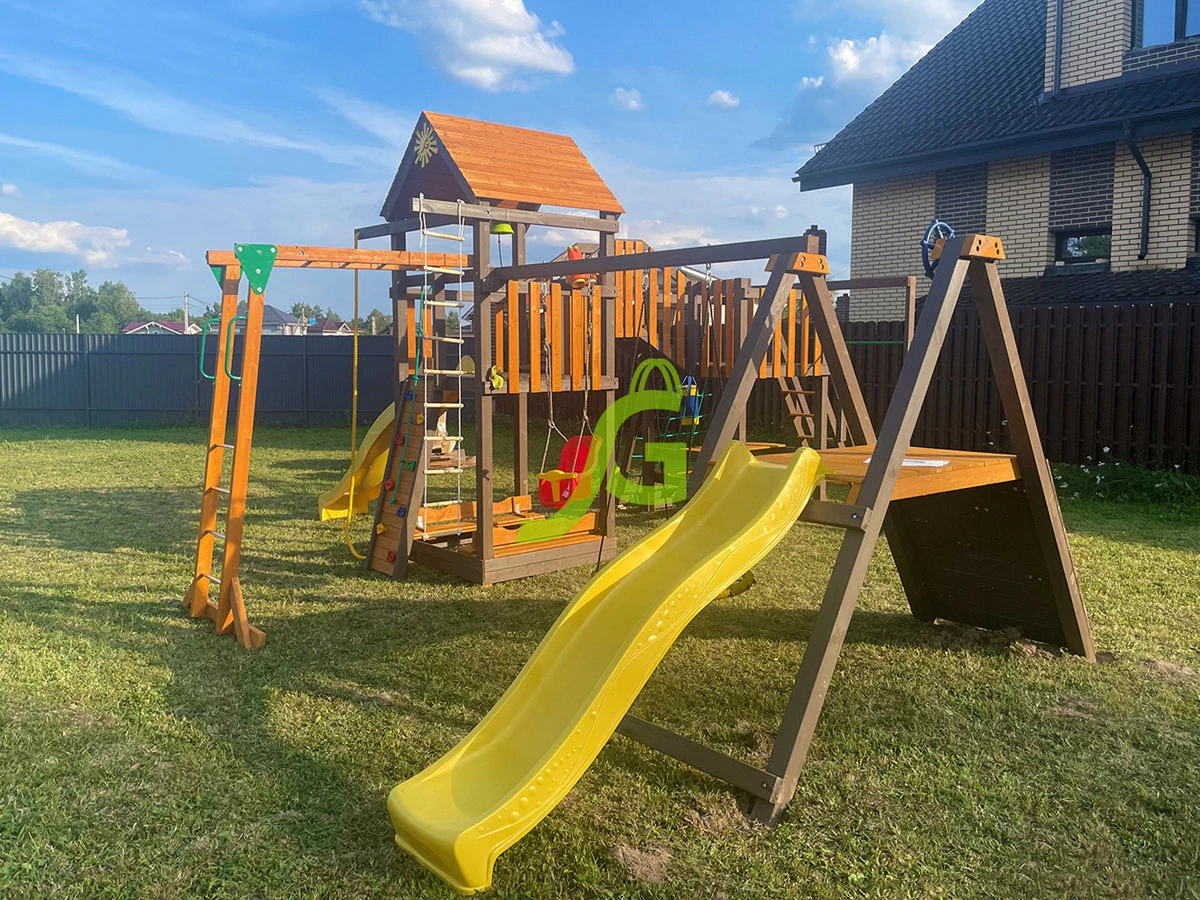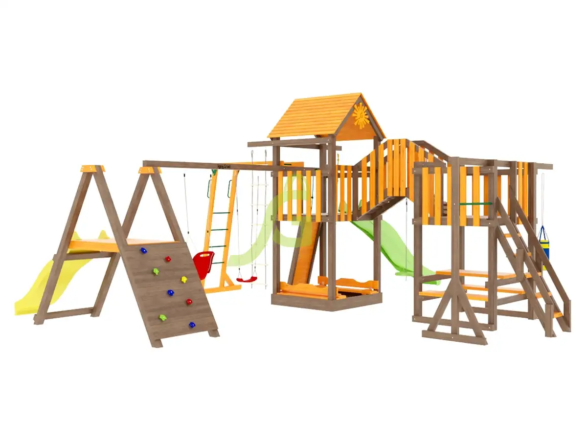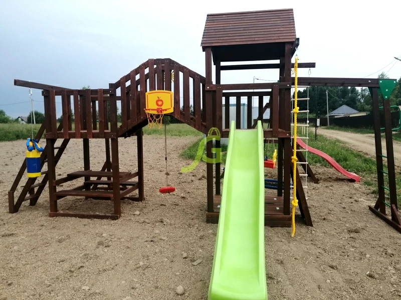 Габариты игрового комплекса имеют длину 7,48 м, высоту 3,25 м, ширина составляет 6,2 м. Детская площадка представляет собой высокую башню с крышей, оборудованную со всех сторон спортивно-игровыми атрибутами: двумя волновыми горками, скалодромом, канатом, качелями для детей дошкольного и младшего школьного возраста, верёвочной лестницей и сеткой, деревянной лестницей, боксёрской грушей, баскетбольным кольцом, рукоходом, турником.