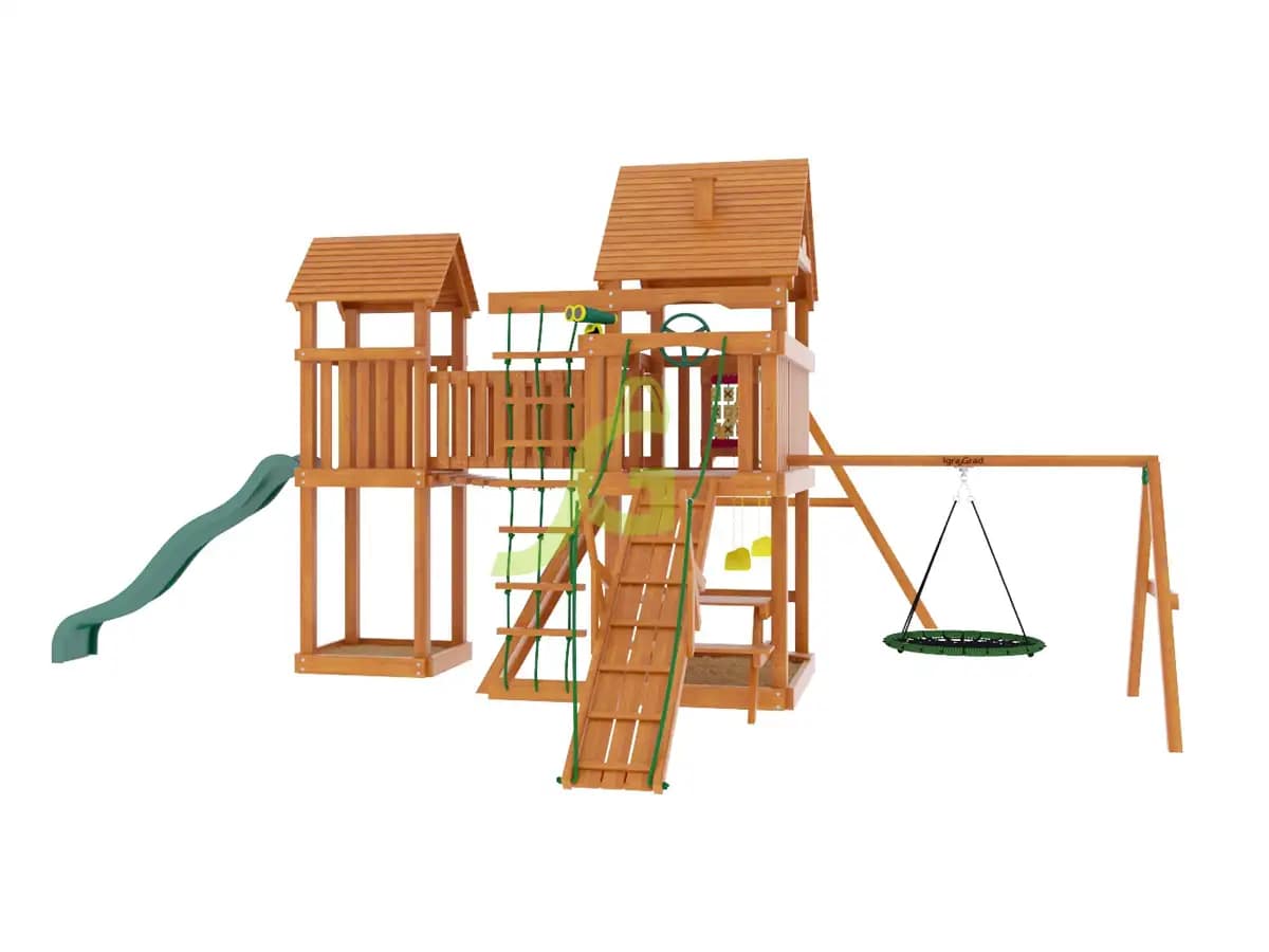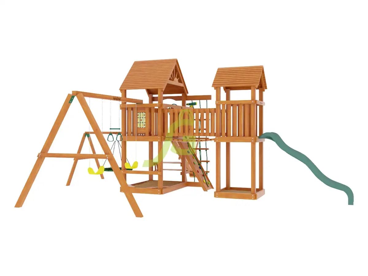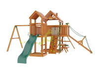 Волнообразная горка обеспечивает малышам весёлый спуск. В самом основании двухуровневого домика находится песочница и столик с лавочкой. Домик дополняется башней и мостиком, что позволяет ребёнку играть не в одиночку, а со своими приятелями. Доска для игры в «Крестики-нолики» зафиксирована на втором уровне домика.