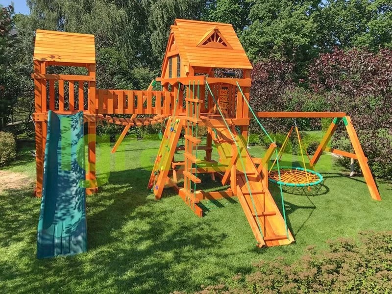 Детская площадка изготовлена из дерева, комплектующие элементы выполнены из прочного материала. Конструкция безопасна для детей, ведь при производстве учитывались все правила безопасности. Внешнее оформление прекрасно вписывается в ландшафтный дизайн и преображает вид из окна.