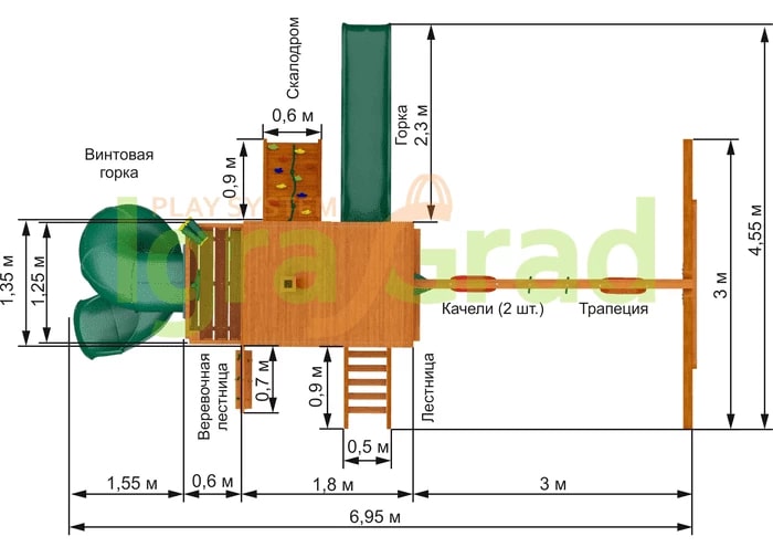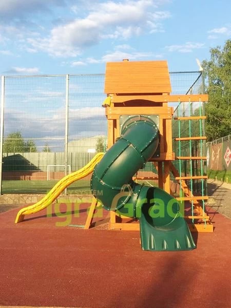 Ребёнок получит море положительных эмоций, скатываясь с волнистой горки или с трубы, максимальная высота которой 1,5 м. Все дети, а особенно мальчишки обожают лазать по заборам, деревьям, покоряя высоту. Для этого дальновидные специалисты предусмотрели наличие скалолазной стены с разноцветными камушками и канатом.