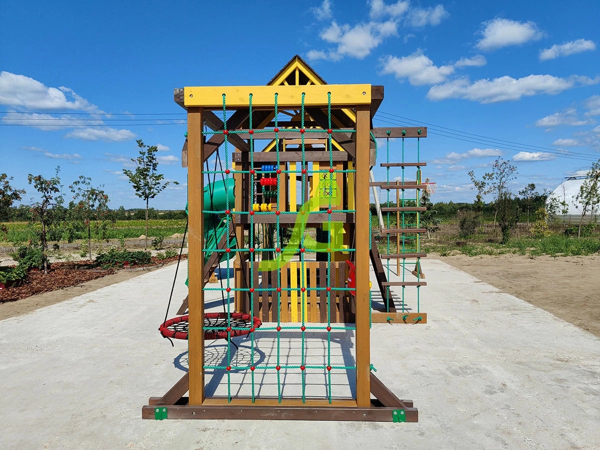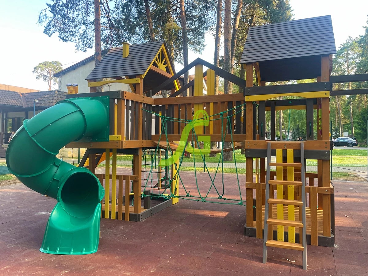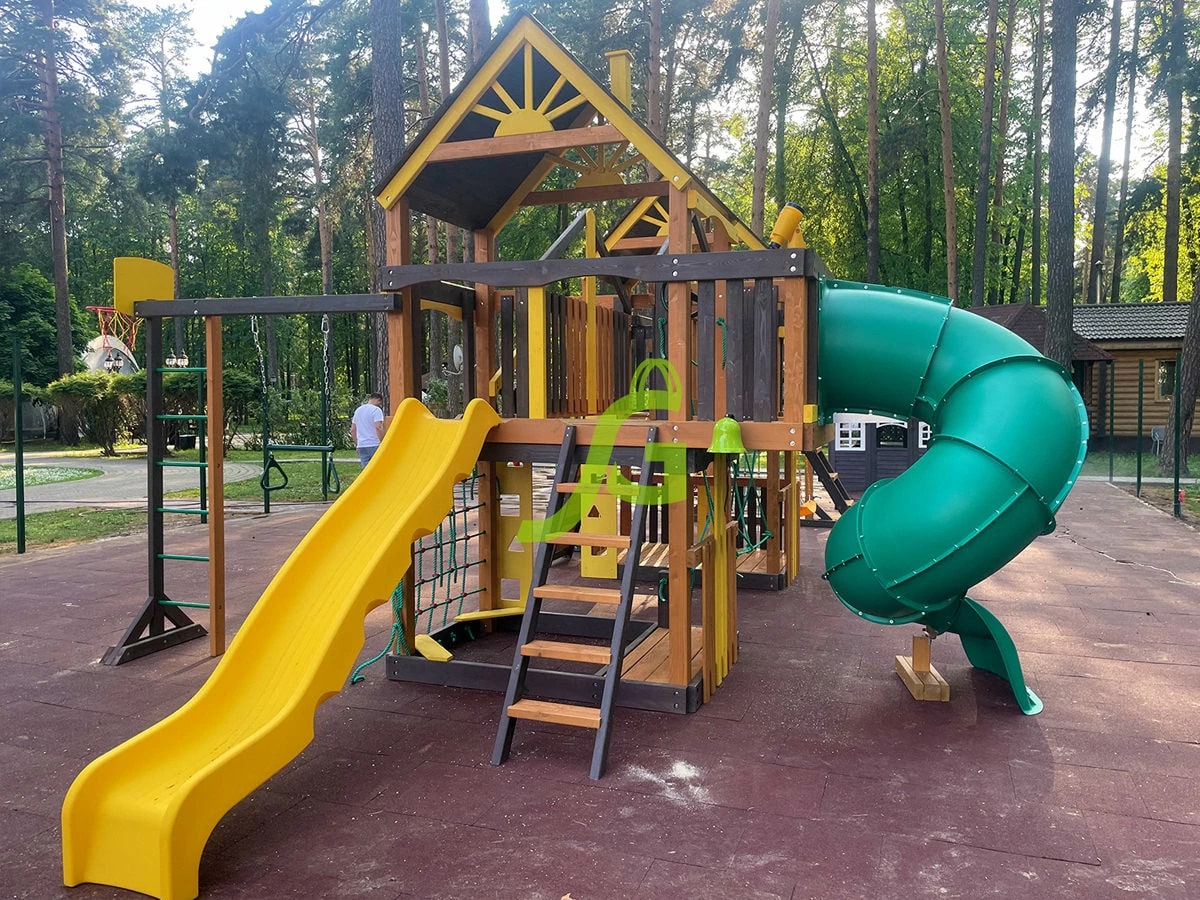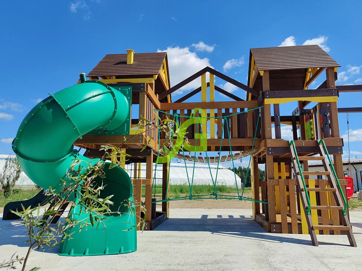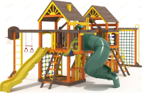 Для весёлого времяпрепровождения предусмотрено наличие волнообразной, винтообразной горок, качелей, панели для игры в «Крестики-нолики», песочницы.