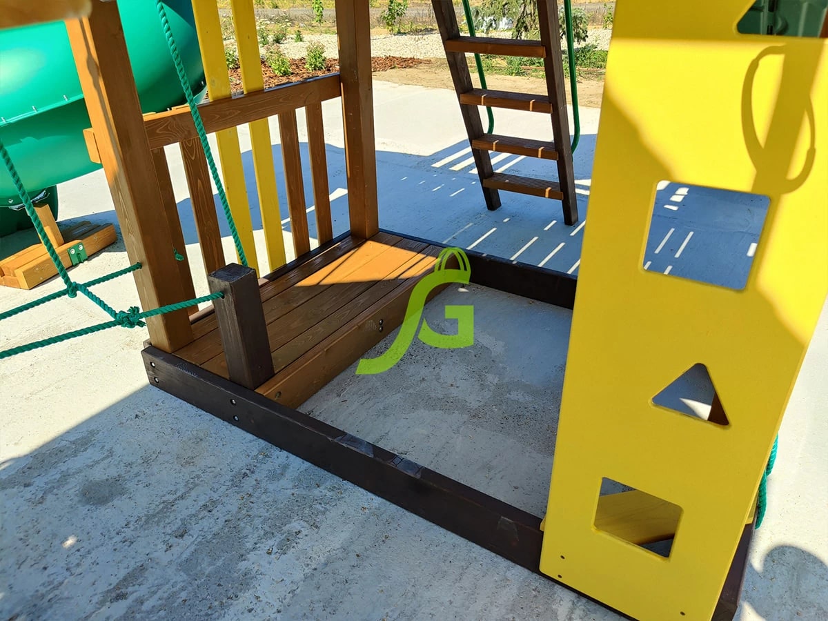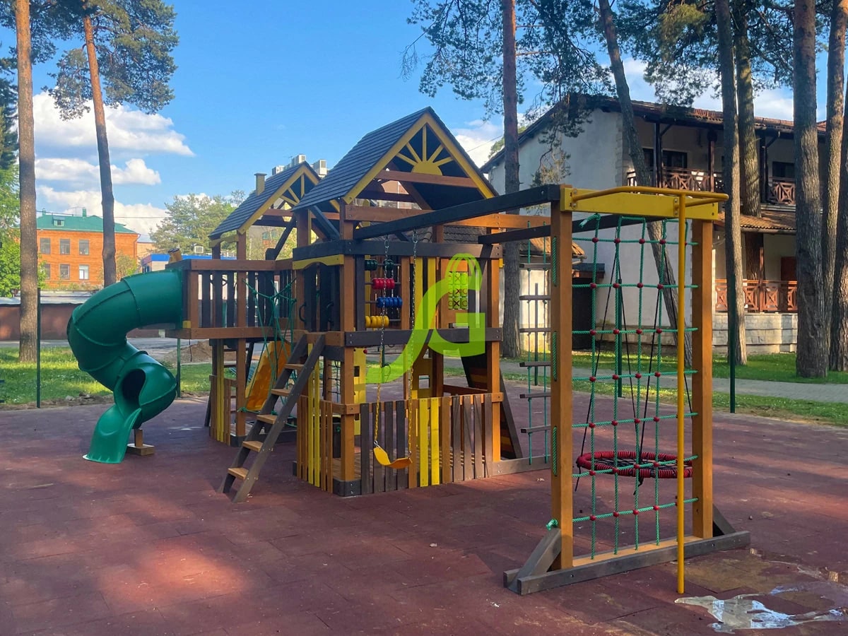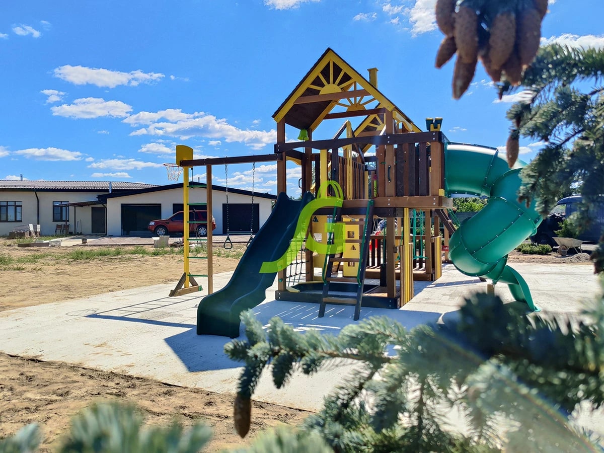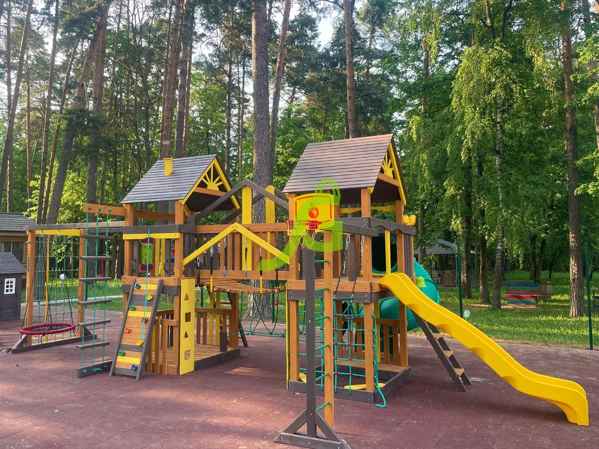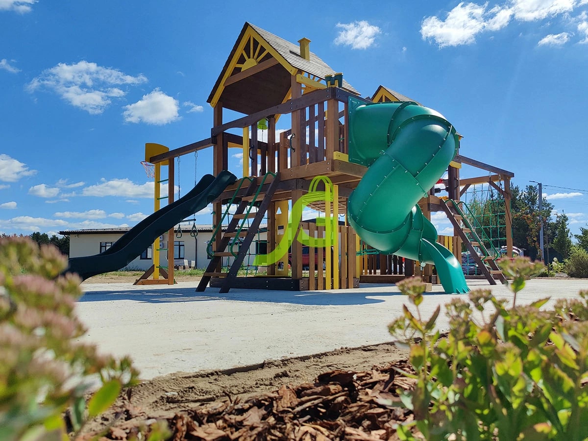 Для весёлого времяпрепровождения предусмотрено наличие волнообразной, винтообразной горок, качелей, панели для игры в «Крестики-нолики», песочницы.