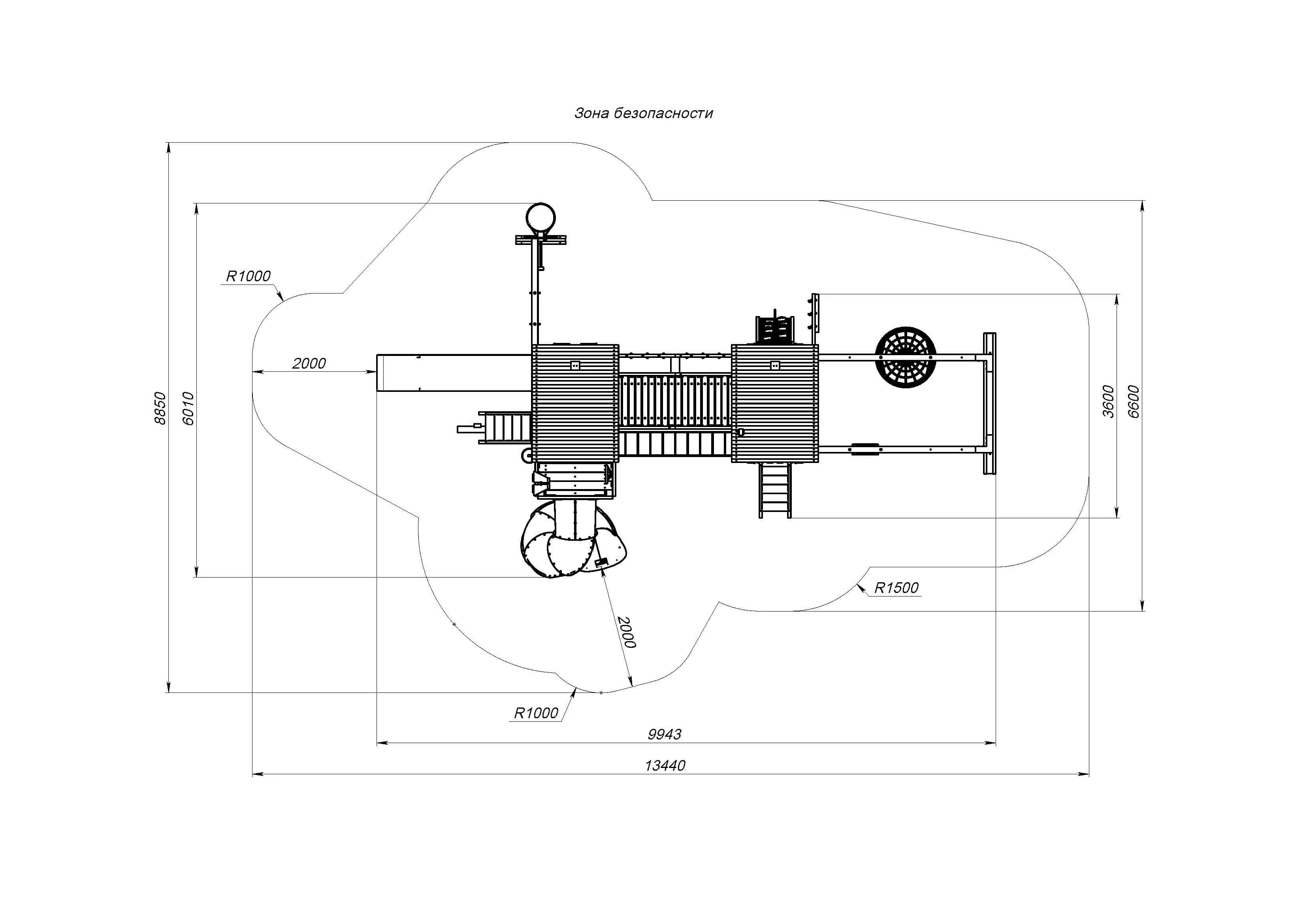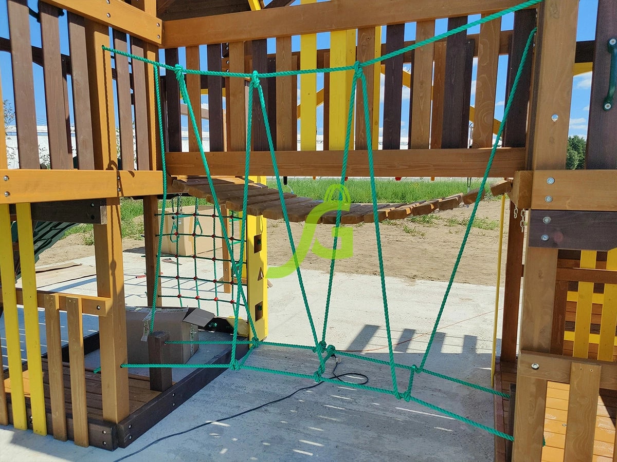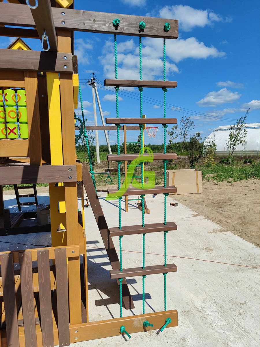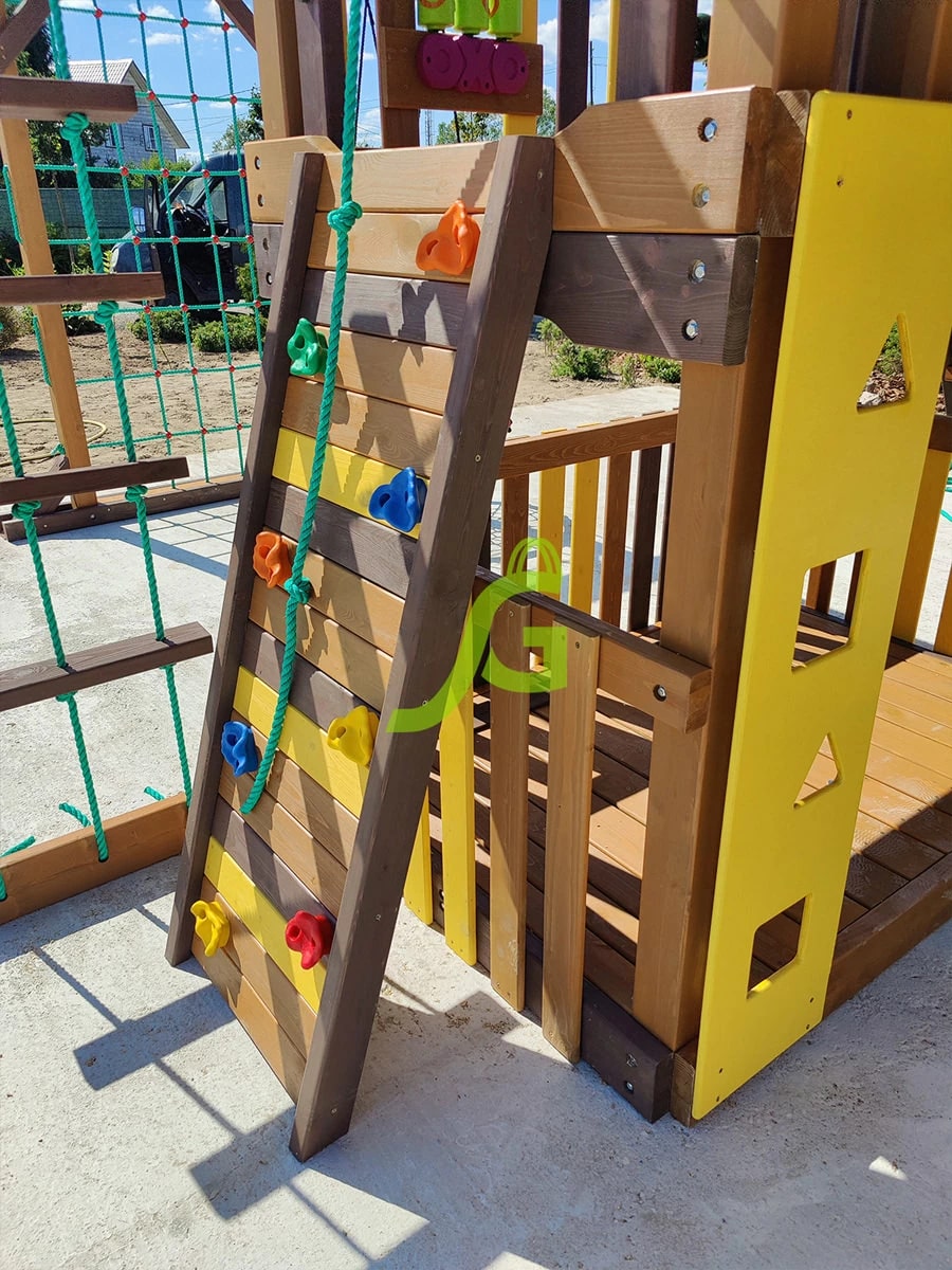 Для весёлого времяпрепровождения предусмотрено наличие волнообразной, винтообразной горок, качелей, панели для игры в «Крестики-нолики», песочницы.