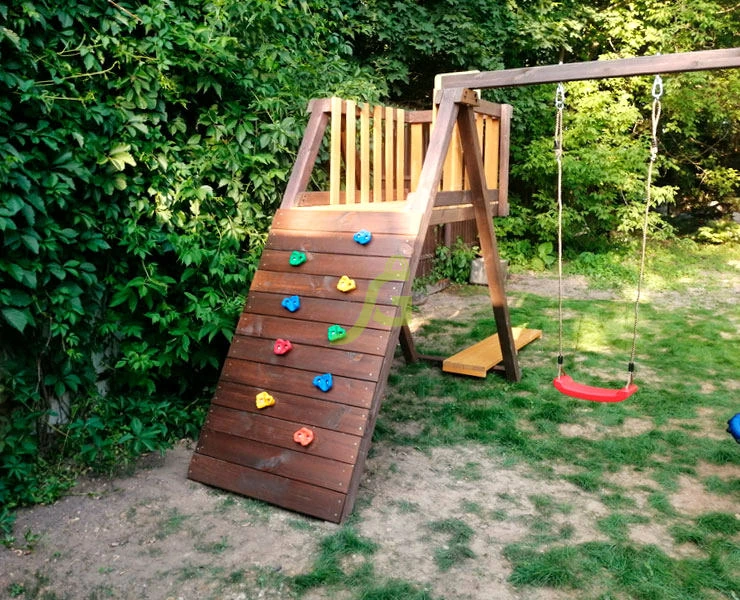Площадка изготовлена из дерева. Это лучший материал для ребёнка. Он приятно пахнет лесом, не выделяет в атмосферу токсины, при любой температуре имеет комфортную фактуру. От внешних негативных факторов древесина защищается нетоксичной пропиткой на водной основе, которую разрешено использовать при производстве детских игрушек.