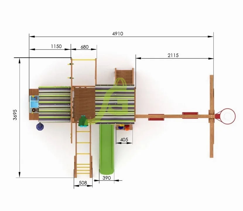 Для физического развития площадка включает множество различных элементов: рукоход, гимнастический кольца, подвесная лестница и скалодром