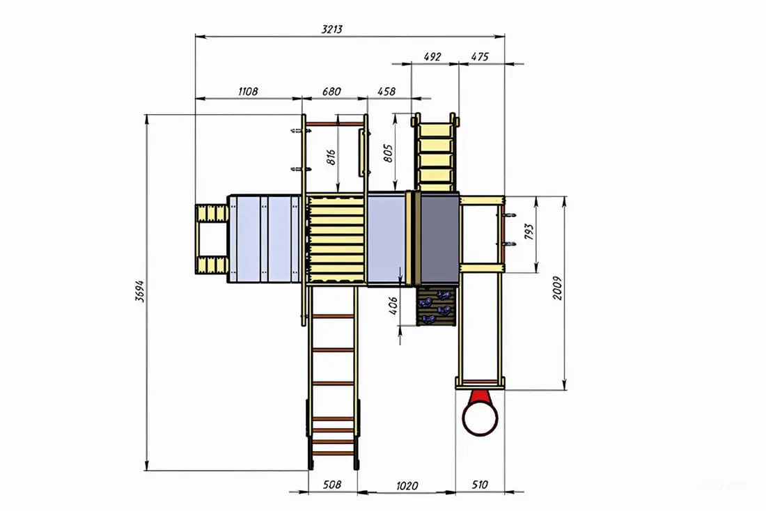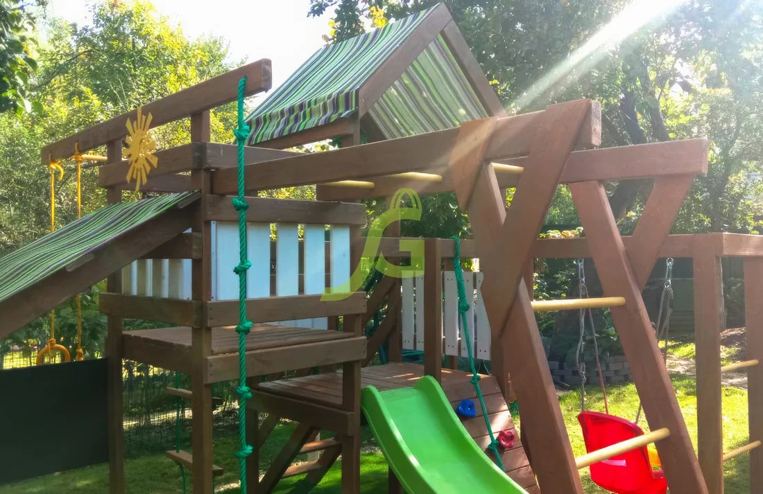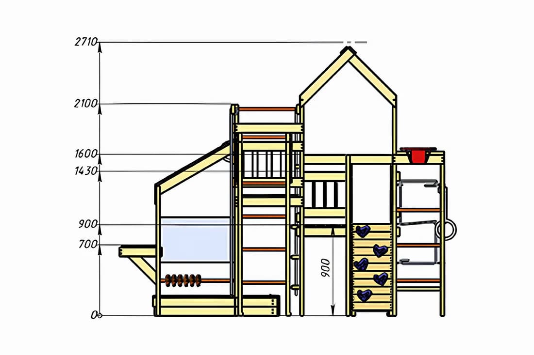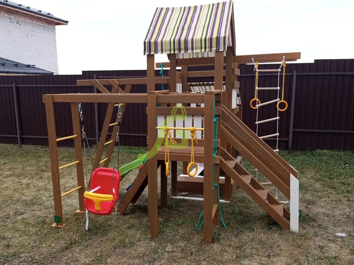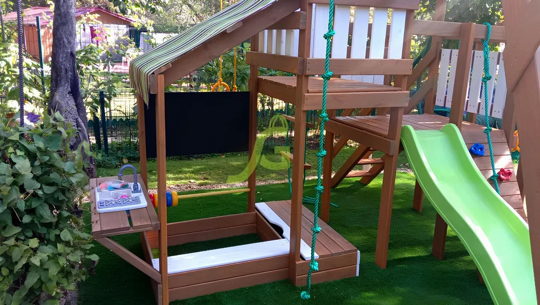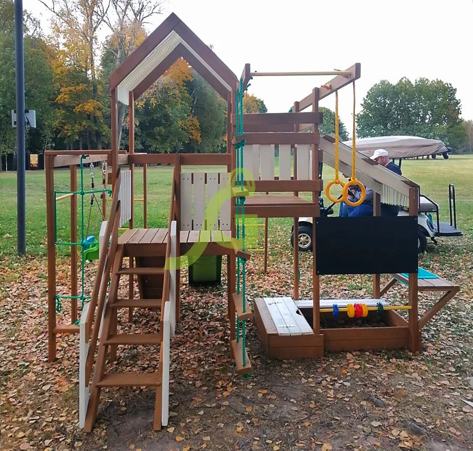 Для физического развития предусмотрены различные элементы: турник, гимнастические кольца, верёвочная лестница и стенка для скалолазания. Дополнительный спортивный модуль с веревочной сеткой, шведской стенкой и турником приятно разнообразят физические активности малыша.