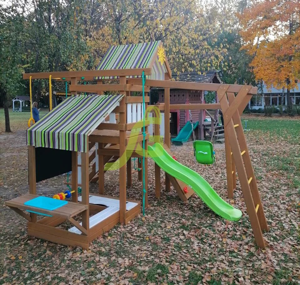 На площадке есть уютный домик с навесом, который защитит ребёнка от солнца и дождя.