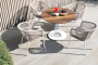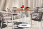 Возможно изготовление стола любого размера и формы по индивидуальному заказу. "Диего" обеденный стол из HPL круглый Ø100см, цвет "дуб", каркас черный 1шт. 1 000Х1 000Х750, "Марсель" стул плетеный из роупа, каркас алюминий белый шагрень, роуп бежевый круглый, ткань бежевая 4шт. 570Х620Х800,