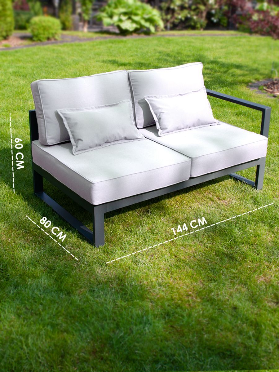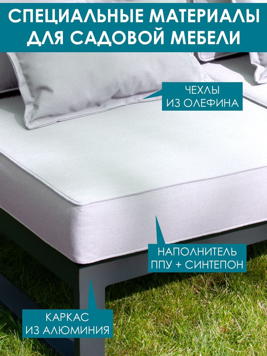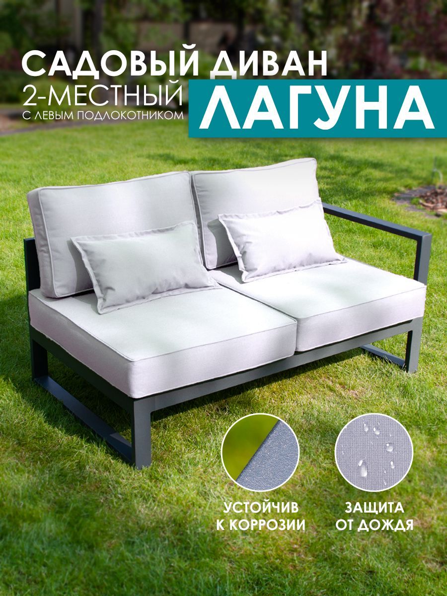 Диван Callisto giardino "Лагуна" 2-х местный (с левым подлокотником). Каркас: алюминий, окрашенный в цвет антрацит. Размеры дивана ШхВхГ 1380х600х800 мм. Размеры подушек: для сиденья ШхВхГ 660х120х800 мм; Вес: 3 кг. Подушка под спину 660х390 мм. Вес: 1,8 кг. Ткань оксфорд, устойчива к истиранию, выгоранию на солнце, влагоотталкивающая. Наполнитель: многослойный формованный ППУ различной плотности, синтепон и спанбонд. Чехлы подушек на молнии. Вес изделия: 12,2 кг. Продукция поставляется в собранном виде (каркас дивана + 6 подушек). Нагрузка до 240 кг. Гарантия: 12 месяцев.