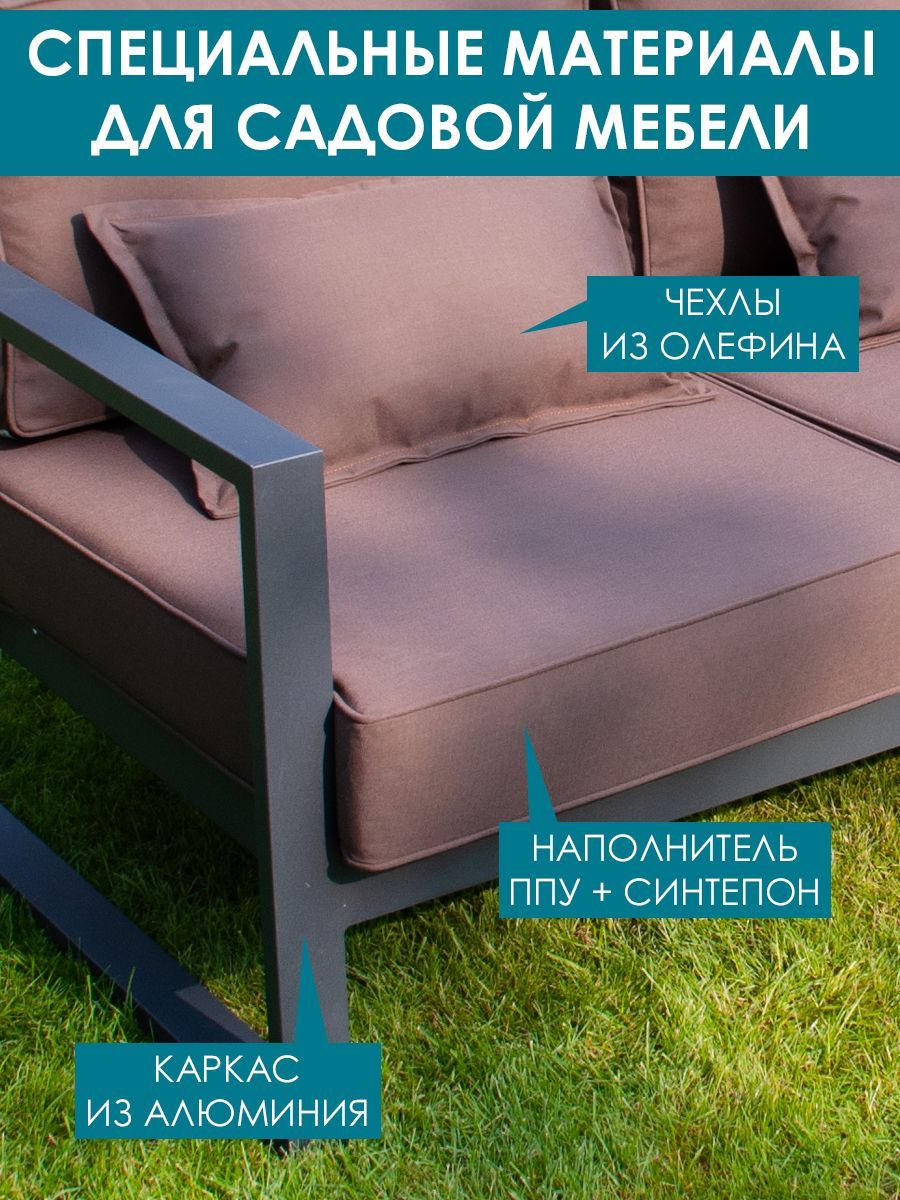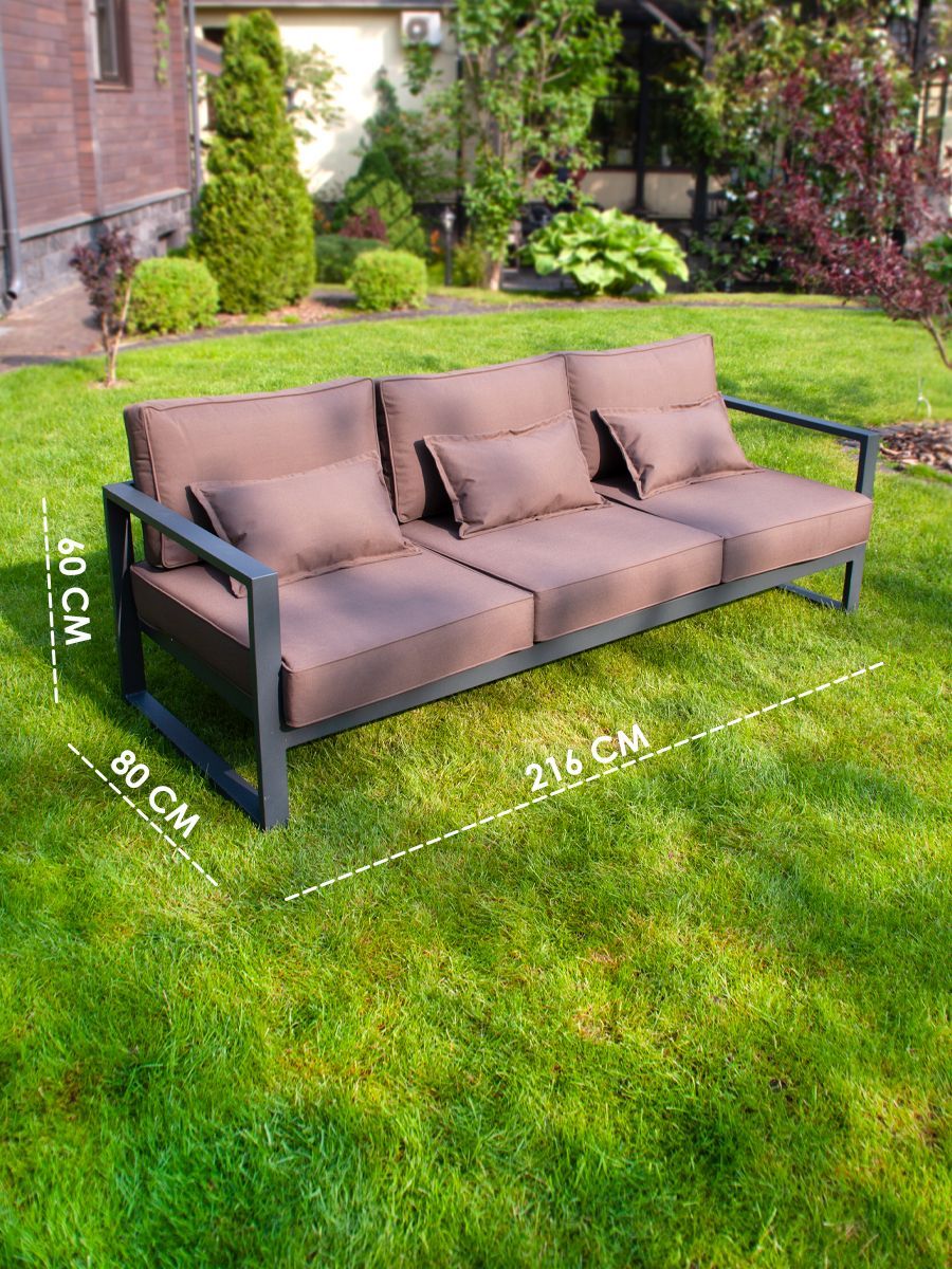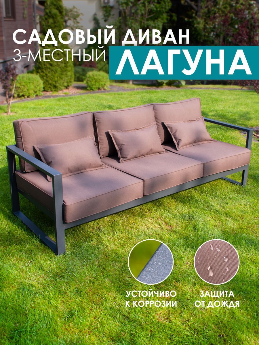 Диван Callisto giardino "Лагуна" 3-х местный ( с двумя подлокотниками). Каркас: алюминий, окрашенный в цвет антрацит. Размеры дивана ШхВхГ 2160х600х800 мм. Размеры подушек: для сиденья ШхВхГ 660х120х800 мм; Вес 3 кг. Подушка под спину 660х390 мм. Вес 1,8 кг. Ткань оксфорд, устойчива к истиранию, выгоранию на солнце, влагоотталкивающая. Наполнитель: многослойный формованный ППУ различной плотности, синтепон и спанбонд. Чехлы подушек на молнии. Вес каркас: 16 кг. Продукция поставляется в собранном виде (каркас дивана + 9 подушек). Нагрузка до360 кг. Гарантия: 12 месяцев.