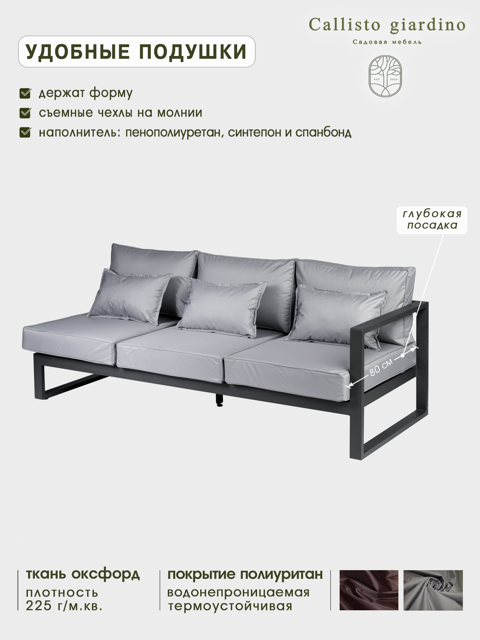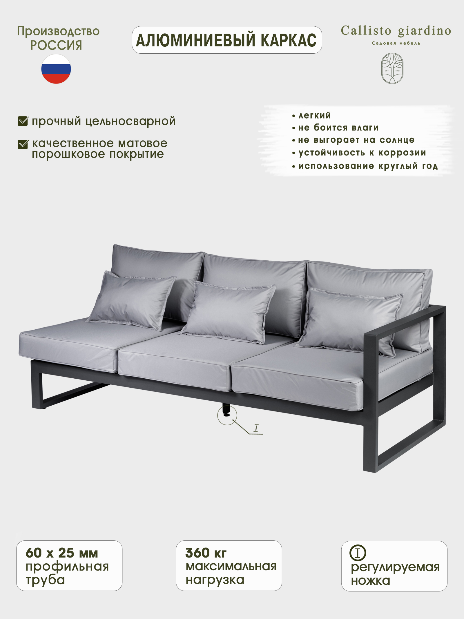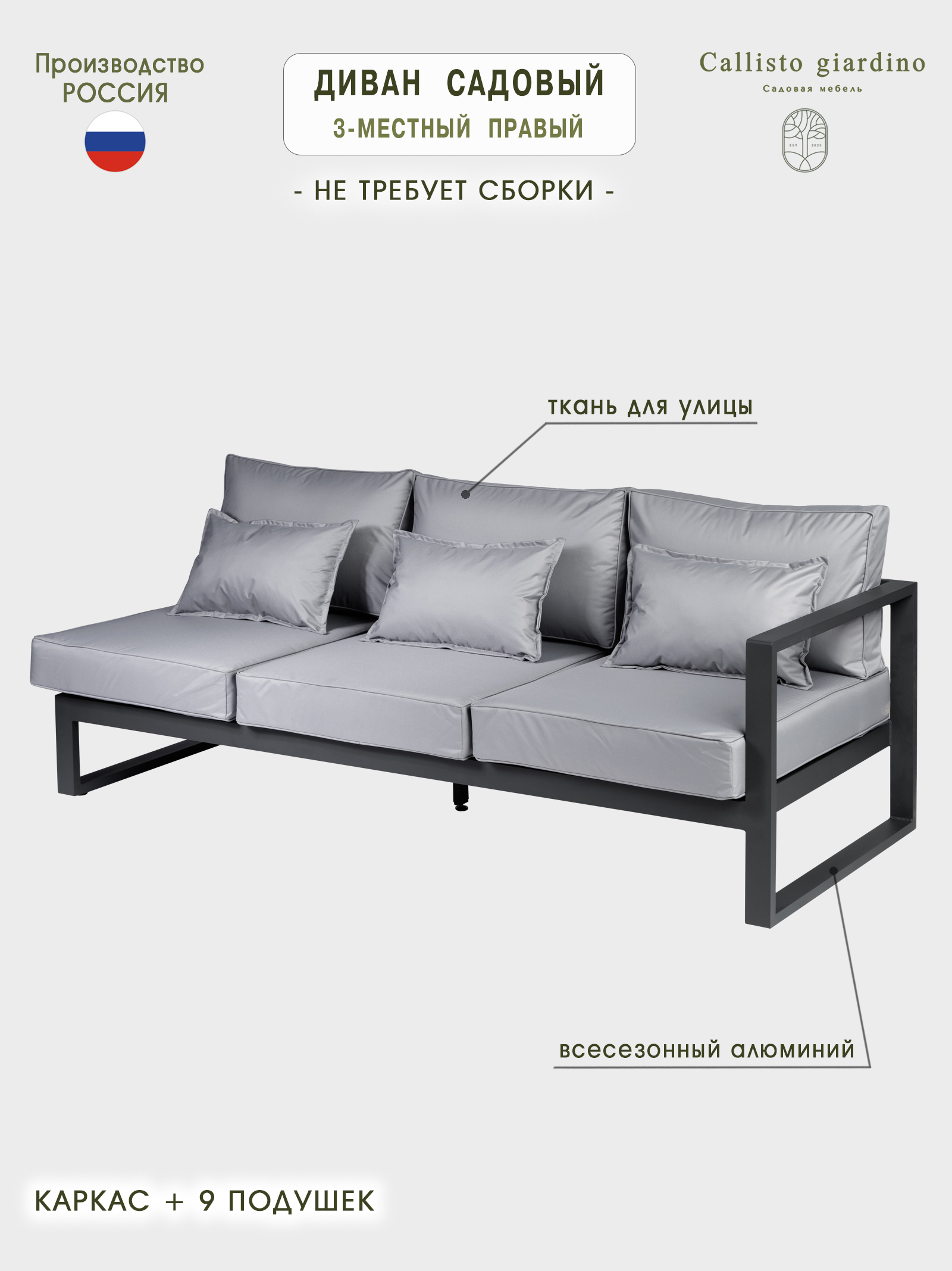 Диван Callisto giardino "Лагуна" 3-х местный правый (с левым подлокотником). Каркас: алюминий, окрашенный в цвет антрацит. Размеры дивана ШхВхГ 2040х600х800 мм. Размеры подушек: для сиденья ШхВхГ 660х120х800 мм; Вес 3 кг. Подушка под спину 660х390 мм. Вес 1,8 кг. Ткань оксфорд, устойчива к истиранию, выгоранию на солнце, влагоотталкивающая. Наполнитель: многослойный формованный ППУ различной плотности, синтепон и спанбонд. Чехлы подушек на молнии. Вес каркас: 16 кг. Продукция поставляется в собранном виде (каркас дивана + 9 подушек). Нагрузка до360 кг. Гарантия: 12 месяцев.