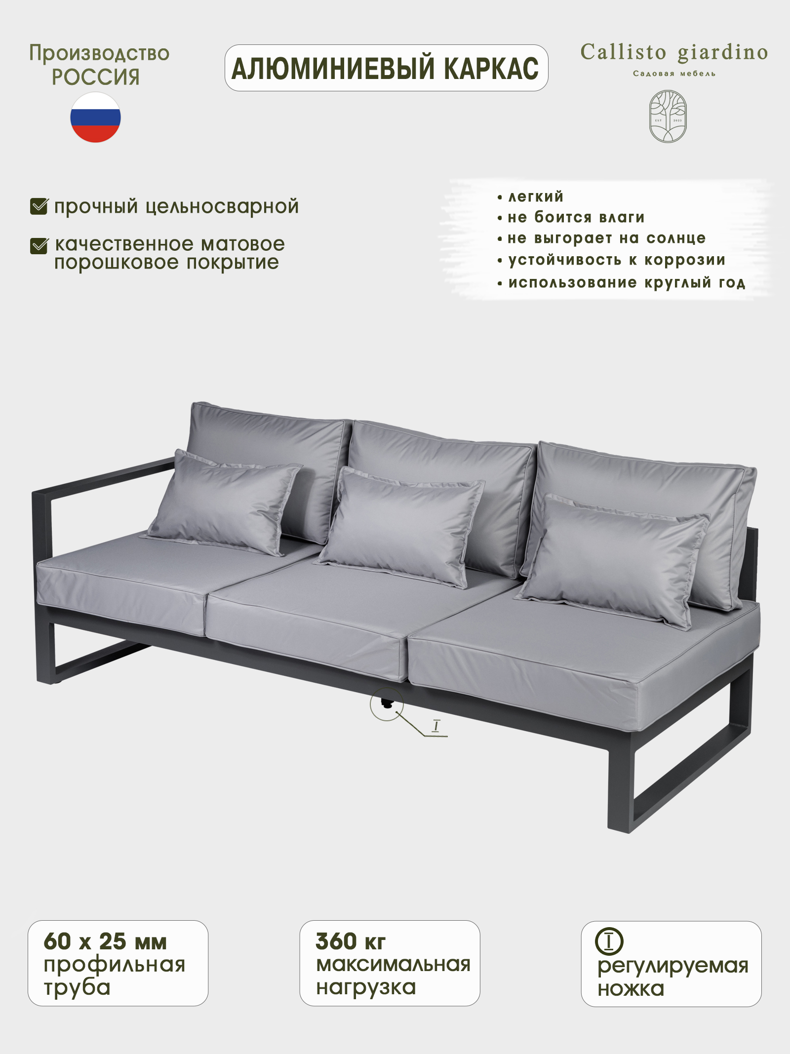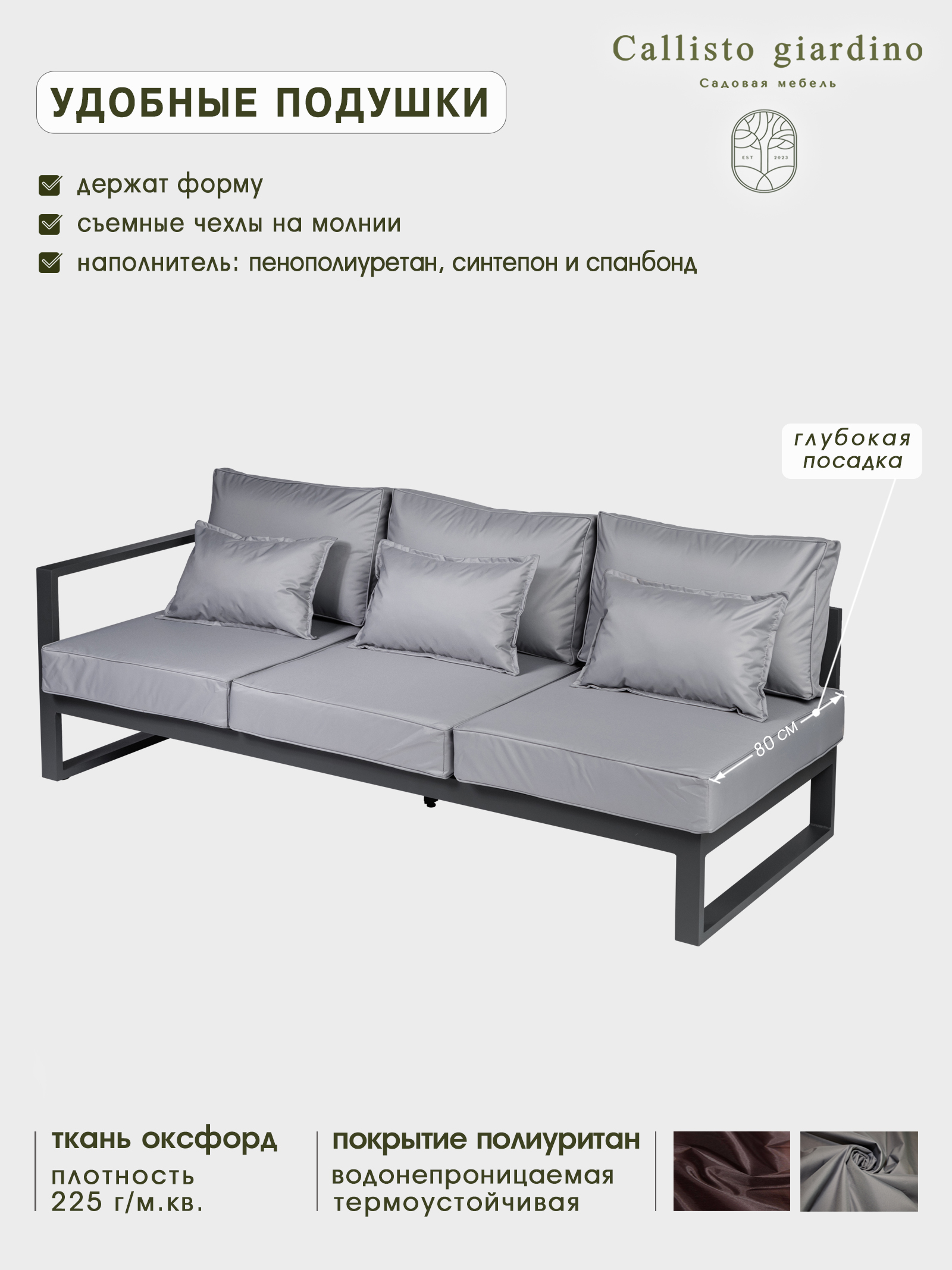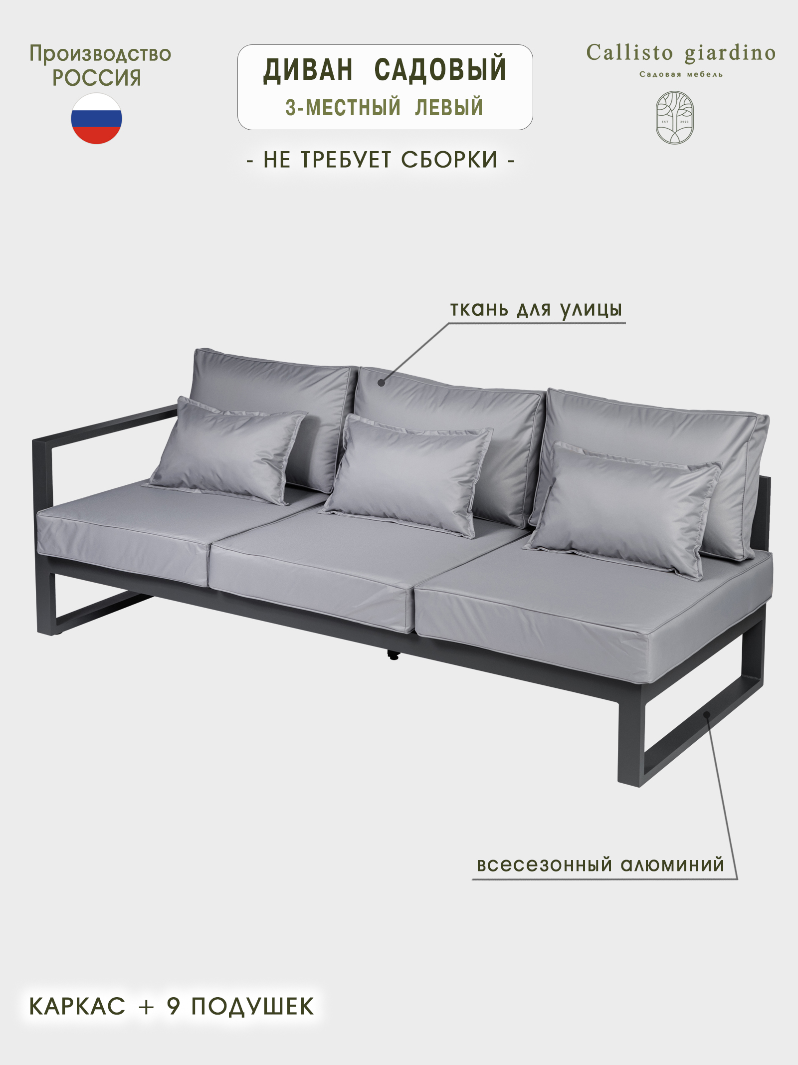 Диван Callisto giardino "Лагуна" 3-х местный левый (с правым подлокотником). Каркас: алюминий, окрашенный в цвет антрацит. Размеры дивана ШхВхГ 2040х600х800 мм. Размеры подушек: для сиденья ШхВхГ 660х120х800 мм; Вес 3 кг. Подушка под спину 660х390 мм. Вес 1,8 кг. Ткань оксфорд, устойчива к истиранию, выгоранию на солнце, влагоотталкивающая. Наполнитель: многослойный формованный ППУ различной плотности, синтепон и спанбонд. Чехлы подушек на молнии. Вес каркас: 16 кг. Продукция поставляется в собранном виде (каркас дивана + 9 подушек). Нагрузка до360 кг. Гарантия: 12 месяцев.