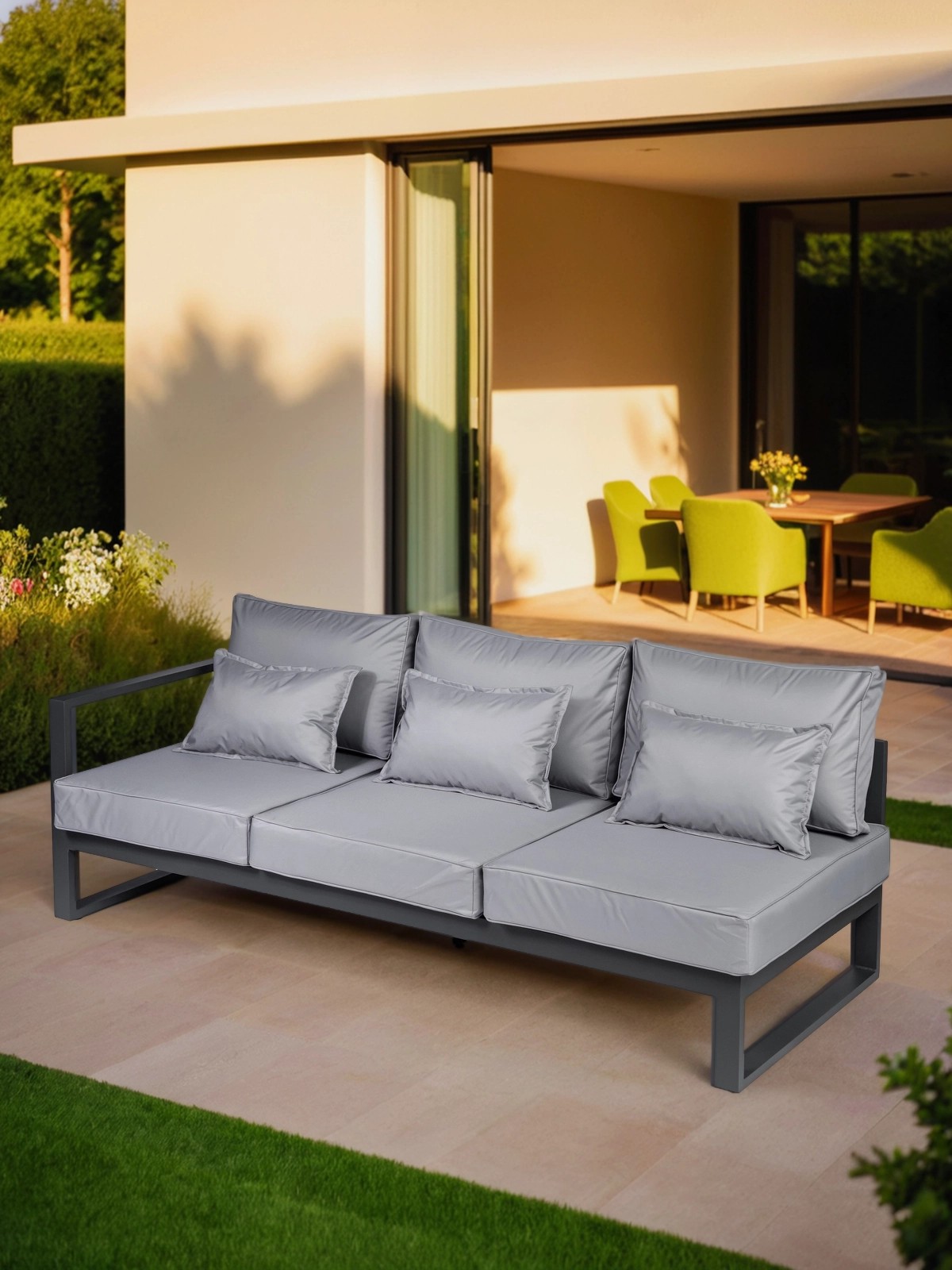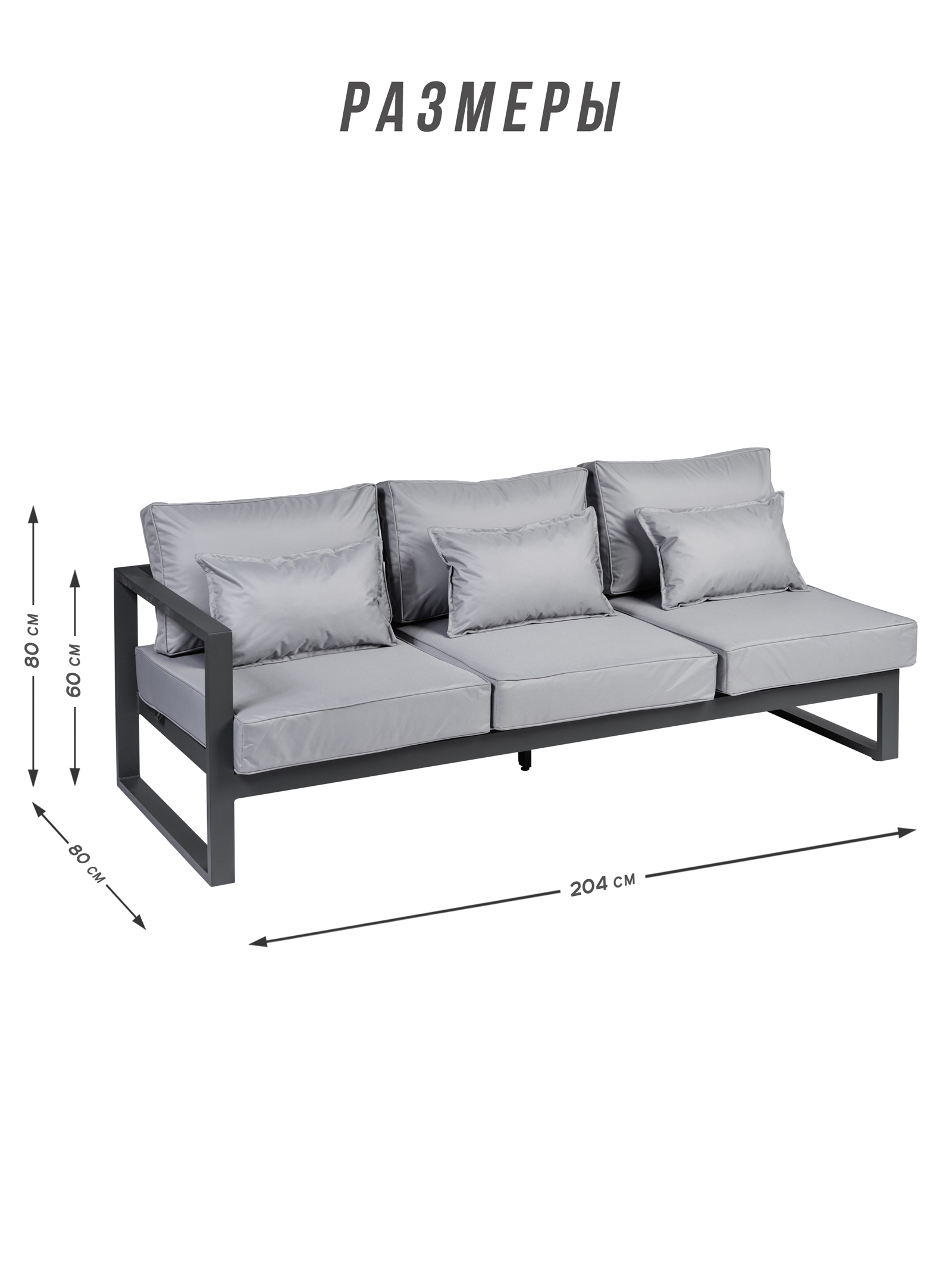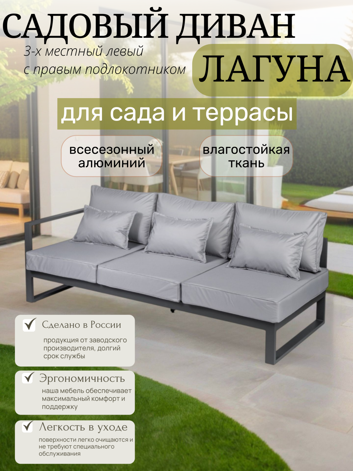 Диван Callisto giardino "Лагуна" 3-х местный левый (с правым подлокотником). Каркас: алюминий, окрашенный в цвет антрацит. Размеры дивана ШхВхГ 2040х600х800 мм. Размеры подушек: для сиденья ШхВхГ 660х120х800 мм; Вес 3 кг. Подушка под спину 660х390 мм. Вес 1,8 кг. Ткань оксфорд, устойчива к истиранию, выгоранию на солнце, влагоотталкивающая. Наполнитель: многослойный формованный ППУ различной плотности, синтепон и спанбонд. Чехлы подушек на молнии. Вес каркас: 16 кг. Продукция поставляется в собранном виде (каркас дивана + 9 подушек). Нагрузка до360 кг. Гарантия: 12 месяцев.