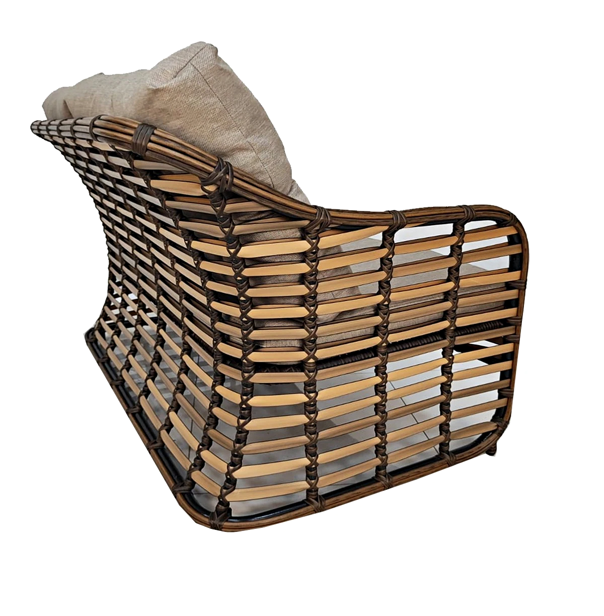Диван трехместный Портофино с подушками из олефина изготовлен из искусственного ротанга для использования на улице и дома.