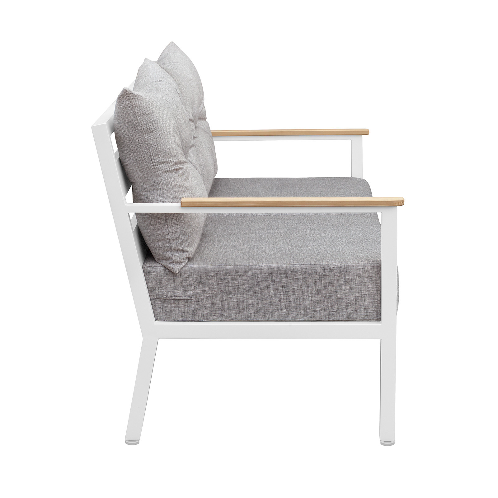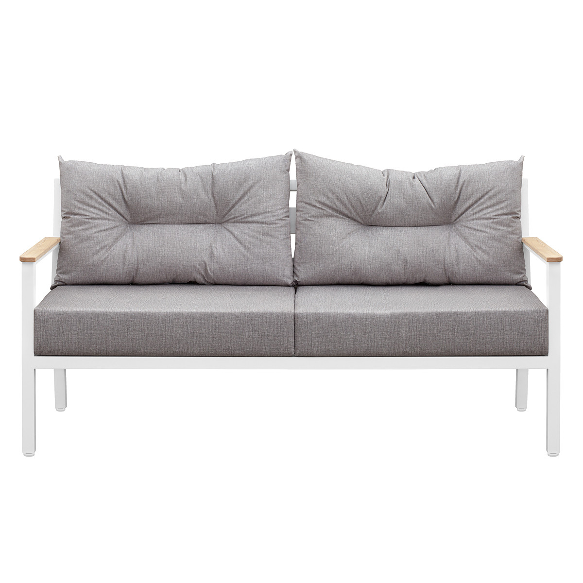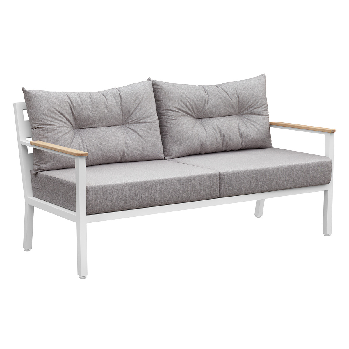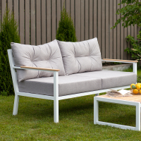 Легкие формы алюминиевого каркаса, устойчивого к любым погодным условиям, отлично дополняются деревянными подлокотниками, покрытыми маслом, что гарантирует их долговечность при эксплуатации на улице. Регулируемые по высоте ножки обеспечат комфортное размещение дивана даже на неидеально ровной поверхности.