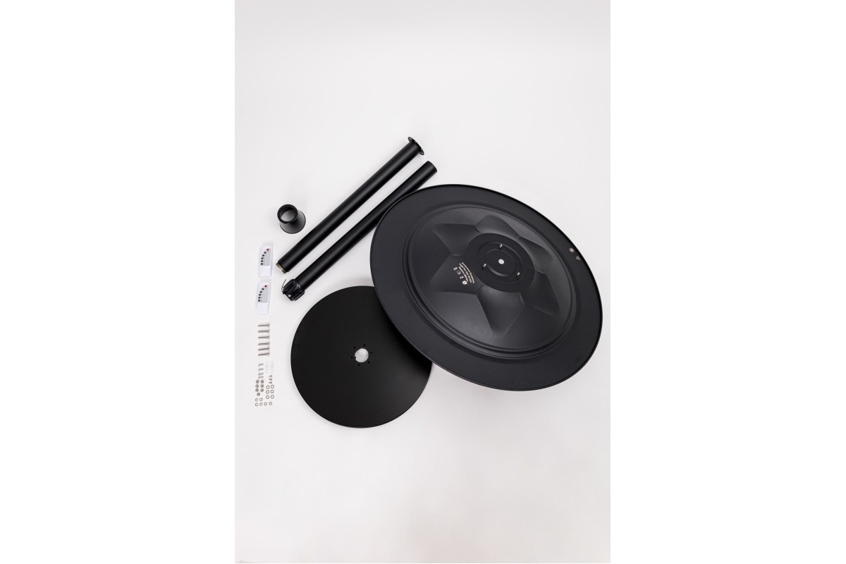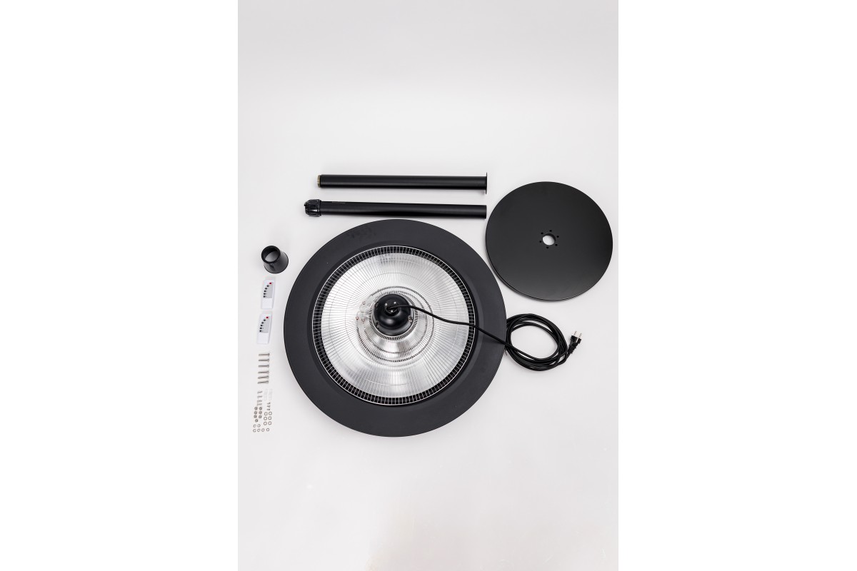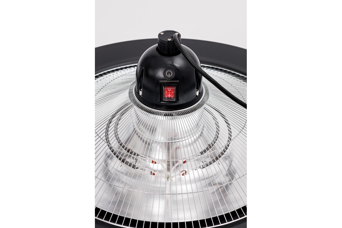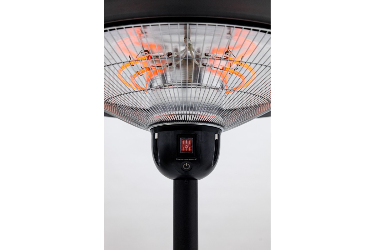 Длинный кабель питания выходит из под основания, соответственно, не висит над полом и не является препятствием для свободного хождения. От платформы электрошнур поднимается вверх внутри металлической трубы, что предупреждает его повреждение и придает изделию эстетичный вид. Открытые детали обогревателя под рефлектором защищены от прямого контакта с руками и с посторонними предметами металлической решеткой.