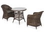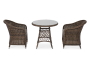 Набор представлен в коричневом цвете. "Равенна" плетеное кресло из искусственного ротанга, цвет коричневый с серой подушкой 2шт. 570Х680Х810, "Эспрессо" плетеный круглый стол, диаметр 80 см, цвет коричневый 1шт. 800Х800Х750,
