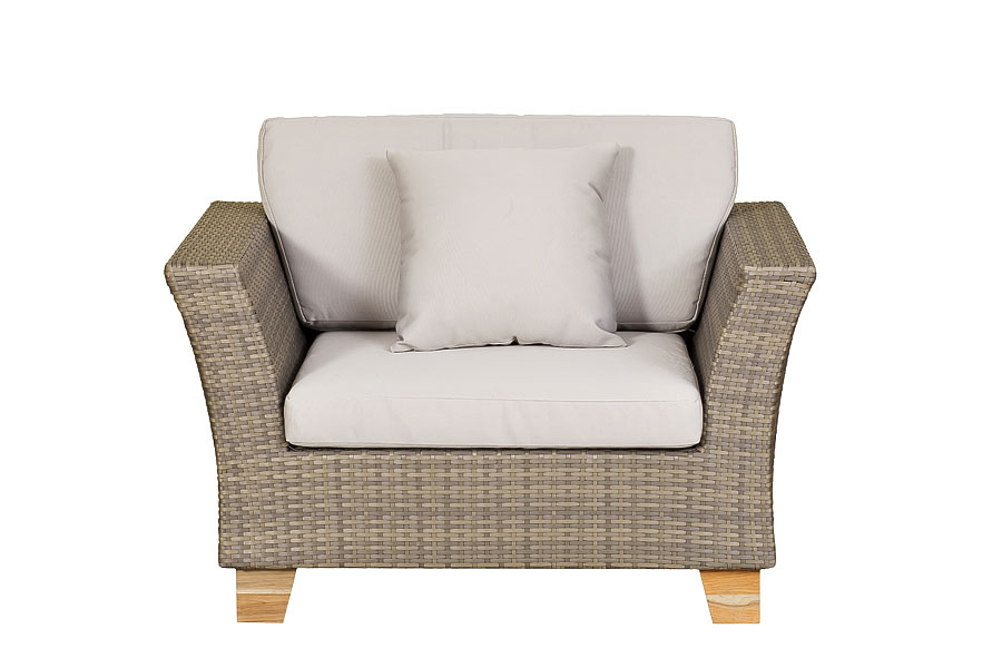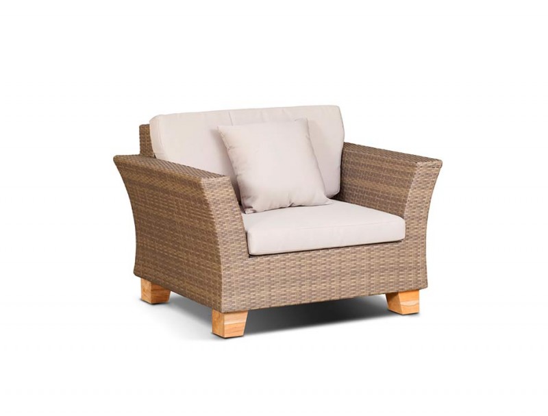 Стильное кресло Феррара из искусственного ротанга. Кресло комплектуется подушками со съемными чехлами для максимального комфорта. Каркас изделия выполнен из алюминия, ножки изготовлены из благородного тикового дерева, что гарантирует продолжительный срок службы модели. Кресло Феррара - оригинальное сочетание природных мотивов, современного стиля и функциональности.