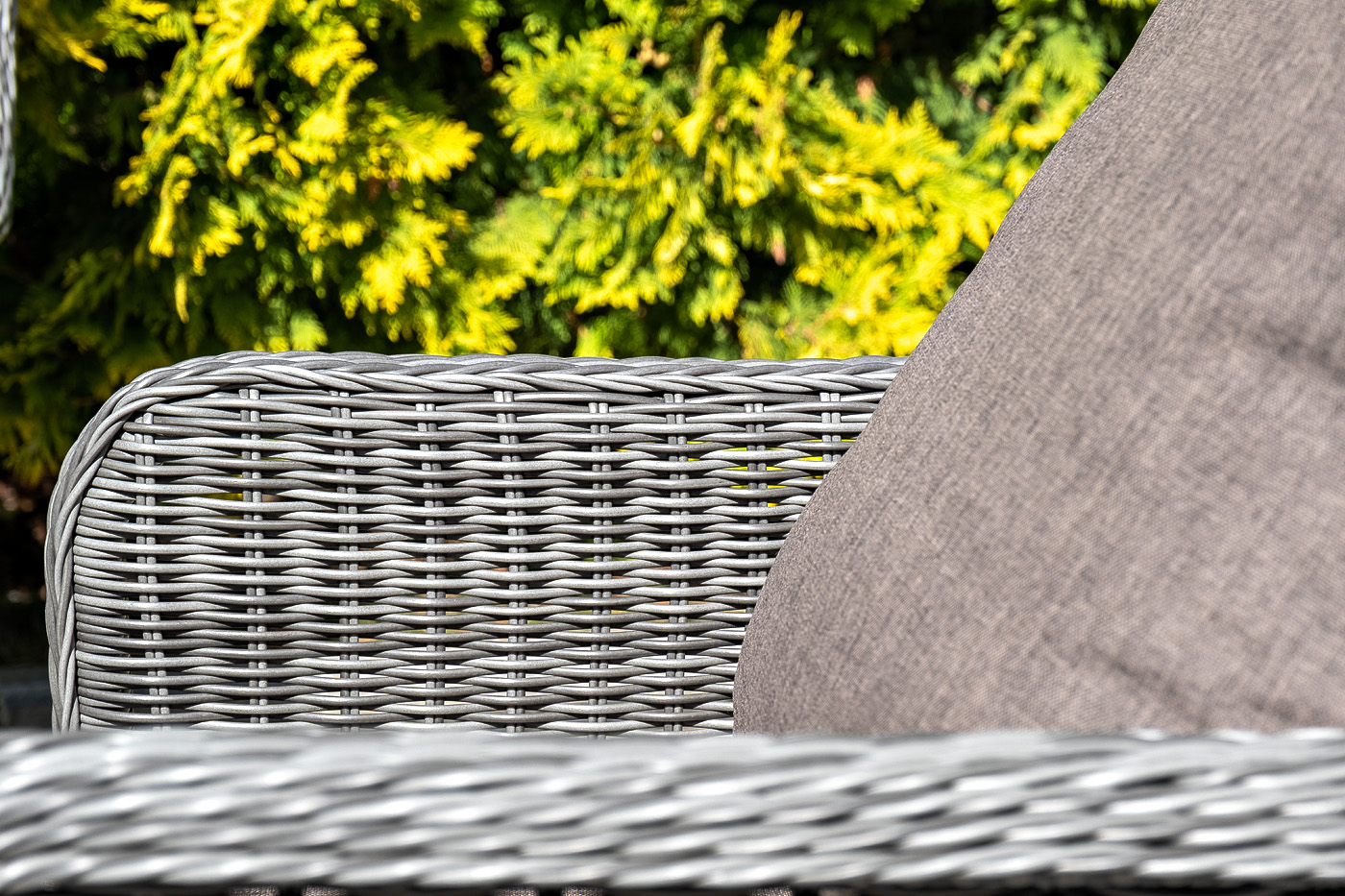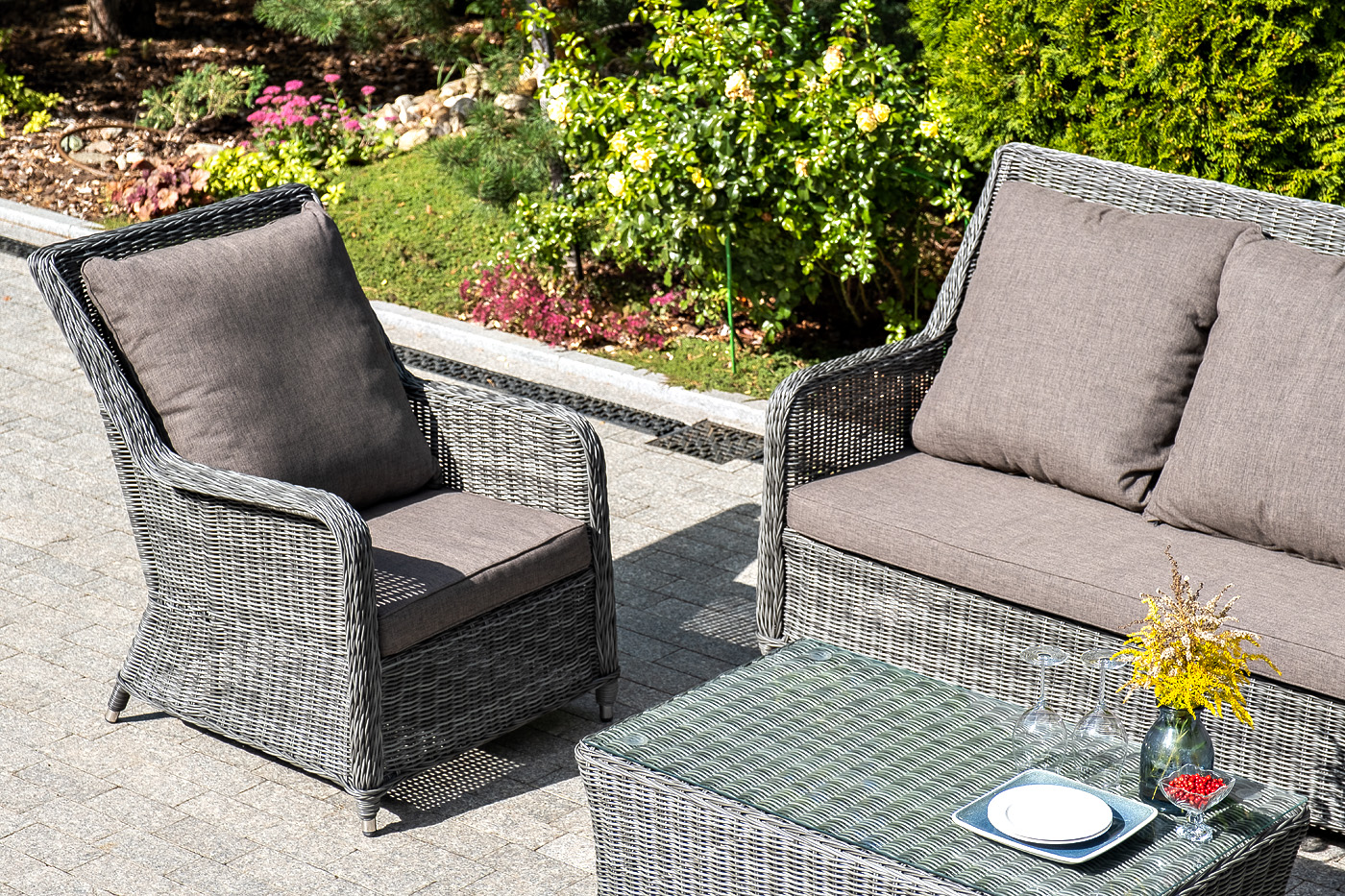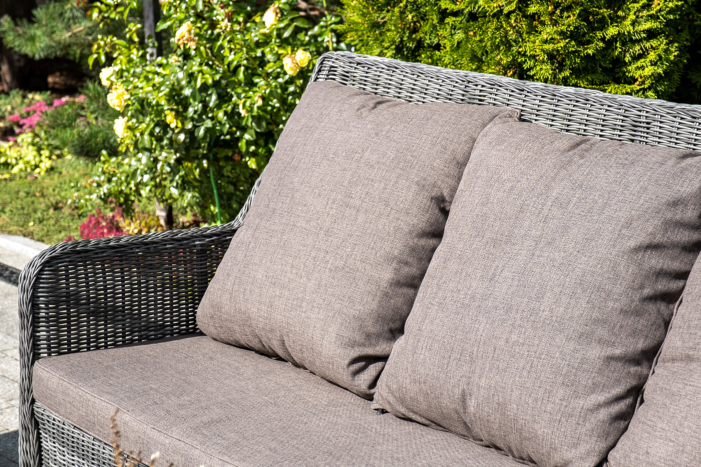 Плетеная мебель дополнена удобными подушками в серо-коричневых чехлах. При их изготовлении используют полиэстер, плотность – 230гр/м2. Он обрабатывается влагоотталкивающей пропиткой для повышения защитных свойств материала.