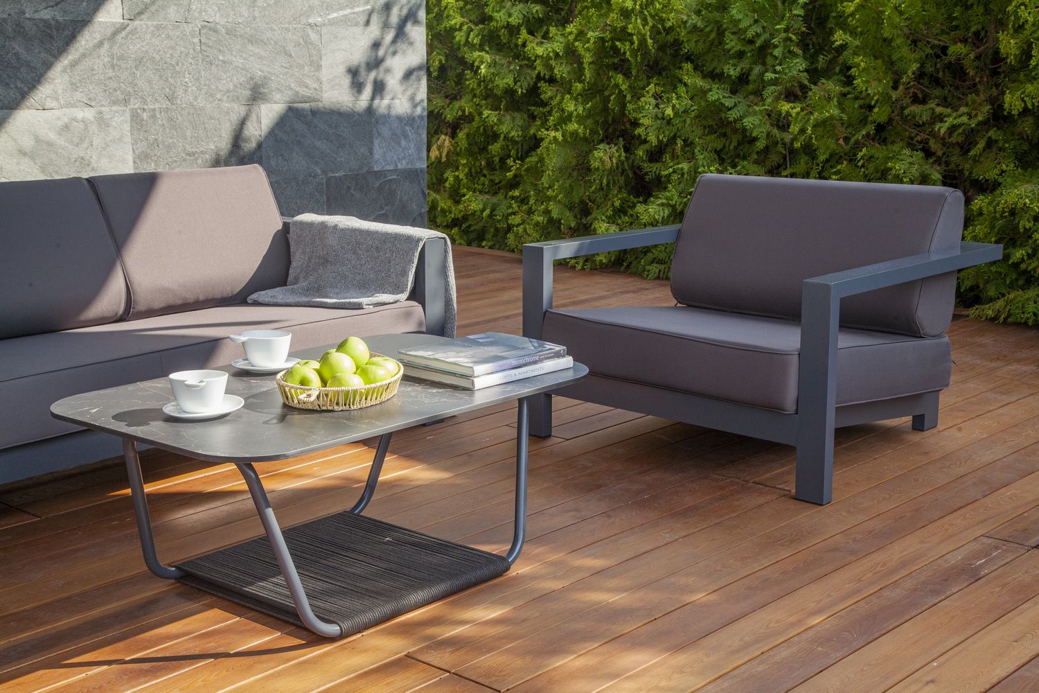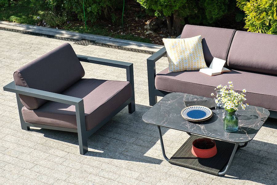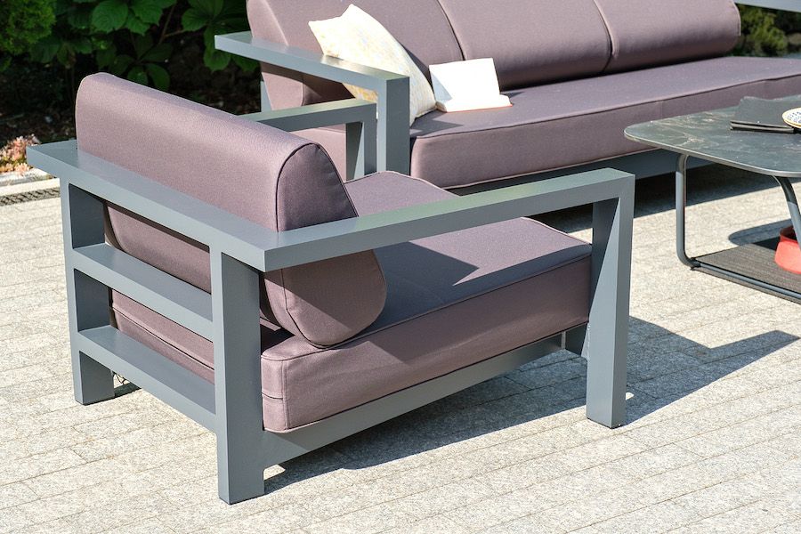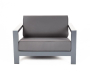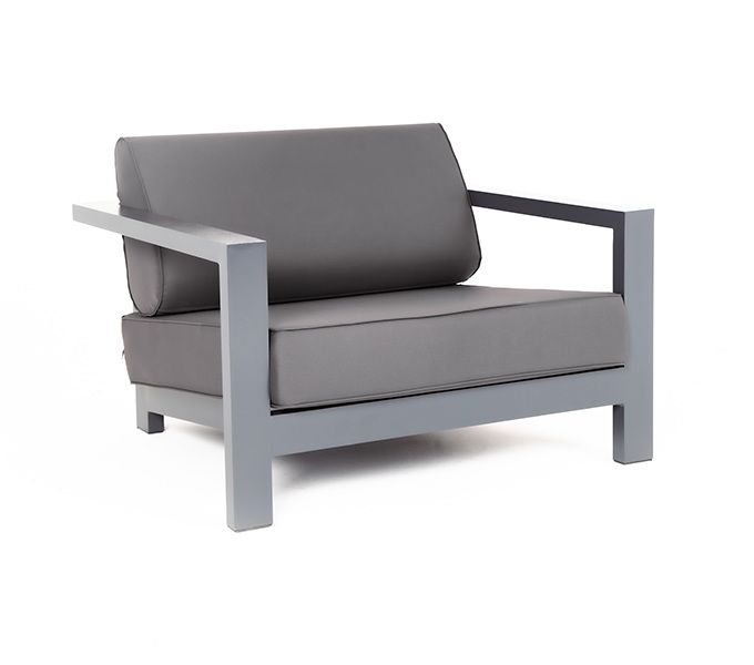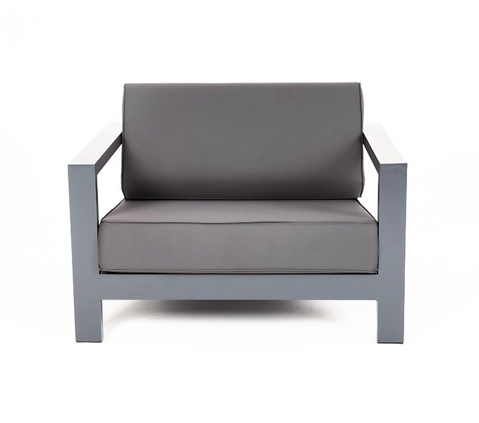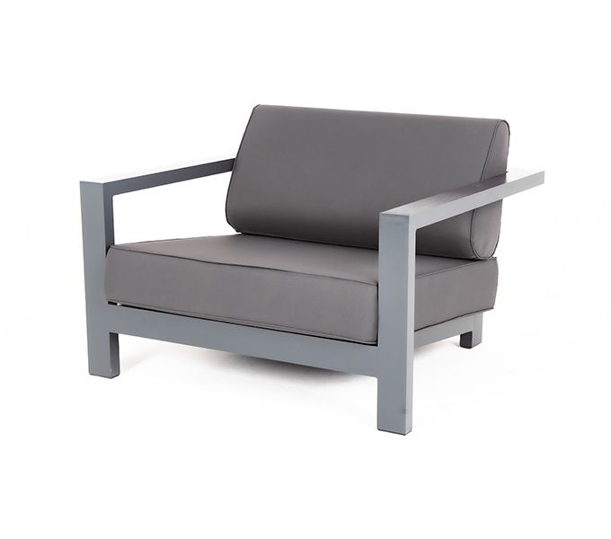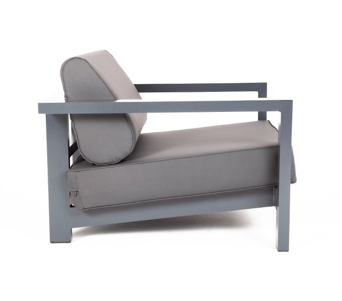 Стильное кресло «Гранада» для создания зоны отдыха. Каркас выполнен из высокопрочного легкого алюминия темно-серого (RAL7024) цвета. На сидениях и спинке предусмотрены подушки темно-серого оттенка.