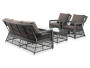Уличная мебель имеет алюминиевый каркас с ручным плетением из искусственного ротанга в цвете "графит". Предусмотрены мягкие подушки из полиэстера серо-коричневого цвета с плотностью 230гр/м2. Они имеет влагоотталкивающую пропитку. Рабочая поверхность столика изготовлена из закаленного стекла толщиной 5 мм.