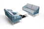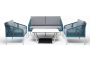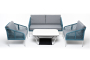 Кресла и диван идут в комплекте с мягкими подушками в чехлах светло-серого цвета. "Канны" кресло плетеное из роупа, каркас алюминий светло-серый (RAL7035) шагрень, роуп бирюзовый круглый, ткань светло-серая 2шт. 700Х700Х750, "Канны" диван 2-местный плетеный из роупа, каркас алюминий светло-серый (RAL7035) шагрень, роуп бирюзовый круглый, ткань светло-серая 1шт. 1 500Х700Х750, "Глория" журнальный стол 100х65см из HPL, цвет молочный 1шт. 1 000Х650Х420,