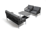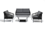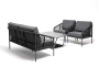 Кресла и диван идут в комплекте с мягкими подушками в чехлах темно-серого цвета. "Канны" диван 2-местный плетеный из роупа (узелки), каркас алюминий темно-серый (RAL7024) муар, роуп темно-серый круглый, ткань темно-серая 1шт. 1 500Х700Х750, "Канны" кресло плетеное из роупа (узелки), каркас алюминий темно-серый (RAL7024) муар, роуп темно-серый круглый, ткань Savana Grafit 2шт. 700Х700Х750, "Гранада" журнальный стол 100х65см из HPL, цвет "серый гранит" 1шт. 1 000Х650Х420,