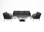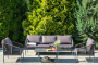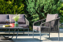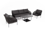 Кресла и диван идут в комплекте с мягкими подушками в чехлах серого цвета. "Канны" диван 3-местный плетеный из роупа, каркас алюминий темно-серый (RAL7024) шагрень, роуп темно-серый круглый, ткань Savana Grafit 1шт. 2 030Х700Х750, "Канны" кресло плетеное из роупа, каркас алюминий темно-серый (RAL7024) шагрень, роуп темно-серый круглый, ткань Savana Grafit 2шт. 700Х700Х750, "Гранада" журнальный стол 100х65см из HPL, цвет "серый гранит" 1шт. 1 000Х650Х420,