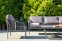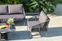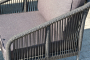Каркас уличной мебели выполнен из износостойкого алюминия. Его дополняет темно-серая ручная оплетка, изготовленная на основе эластичных синтетических лент из полиэфирных волокон высокой прочности.