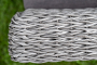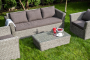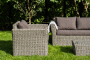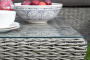 Из алюминия сделан устойчивый каркас мебели. Ее поверхность дополнена искусственным ротангом вида "гиацинт", из которого сделано ручное плетение серого цвета.