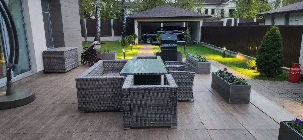 Комплект мебели KARL в сером цвете воплощает в себе комфорт и стиль. Все элементы, включая трехместный диван, два кресла и обеденный стол, выполнены из искусственного ротанга на прочном металлическом каркасе. Это обеспечивает долговечность и надежность мебели, а также делает ее легкой в уходе.