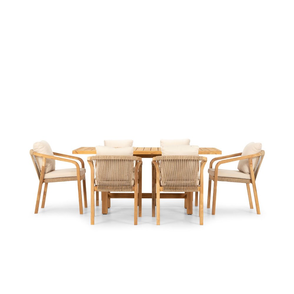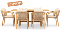 Обеденная группа Ravona, рассчитанная на 6 персон, - это садовая мебель из АКАЦИИ в современном стиле. Дизайнерские формы мебели из этой коллекции создадут стильный и узнаваемый облик зоны отдыха на вашей веранде. Ravona - это современная коллекция садовой мебели из акации, выполненная в комбинации натурального веревочного плетения роуп, акации и бежевых подушек. Цвет натуральной твердой древесины представляет собой натуральный цвет с мелкой текстурой, придающий древесине приятный теплый вид. Ravona - это стиль и элегантность на Вашей веранде.