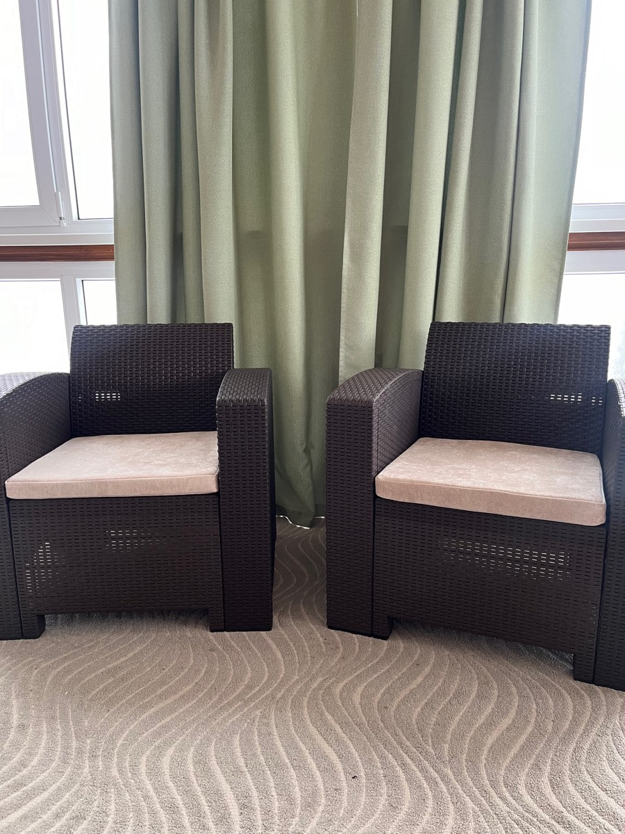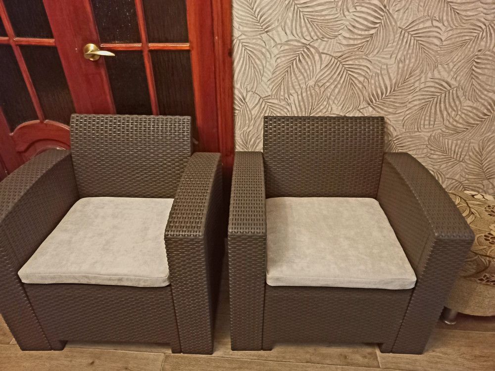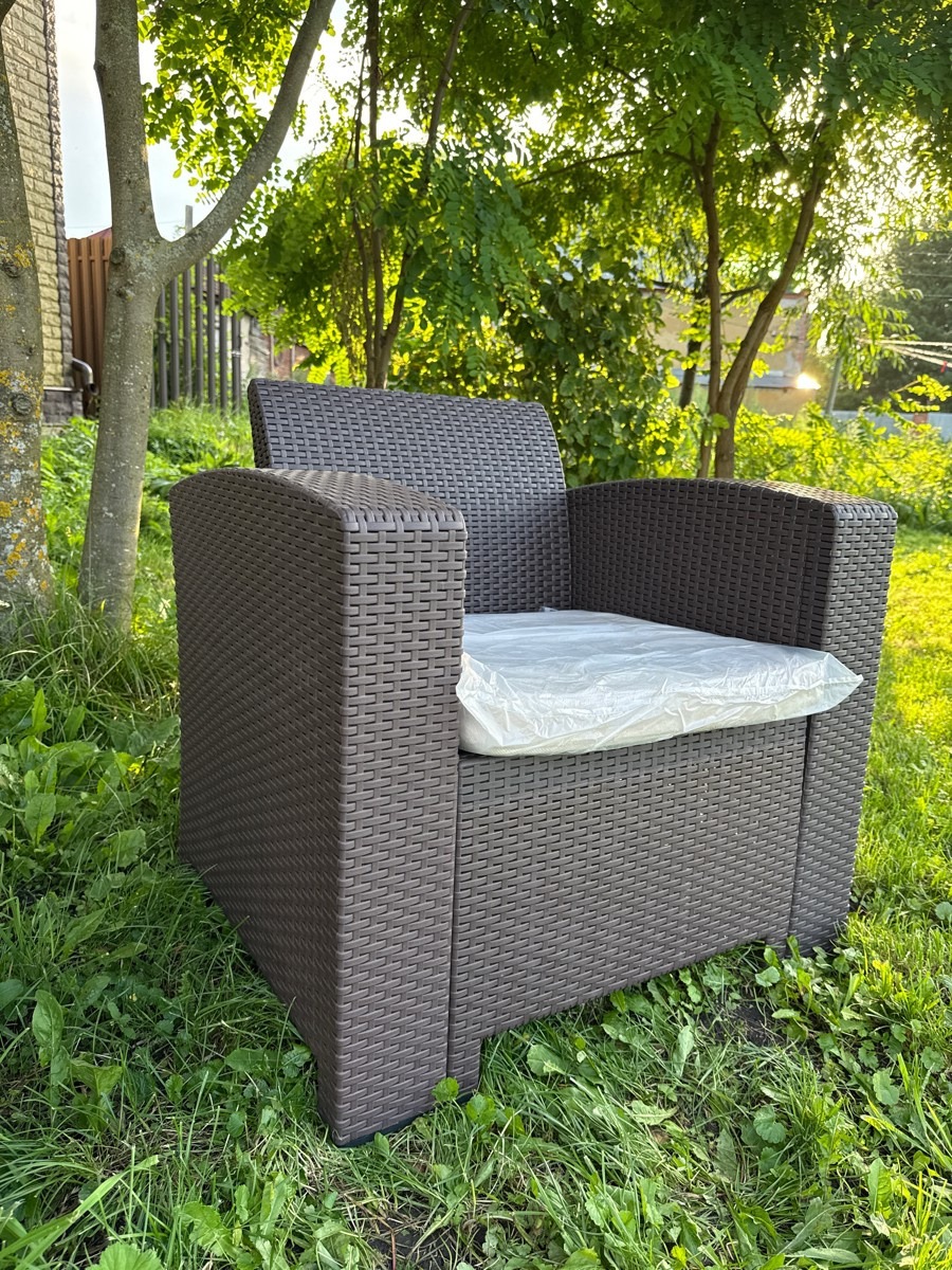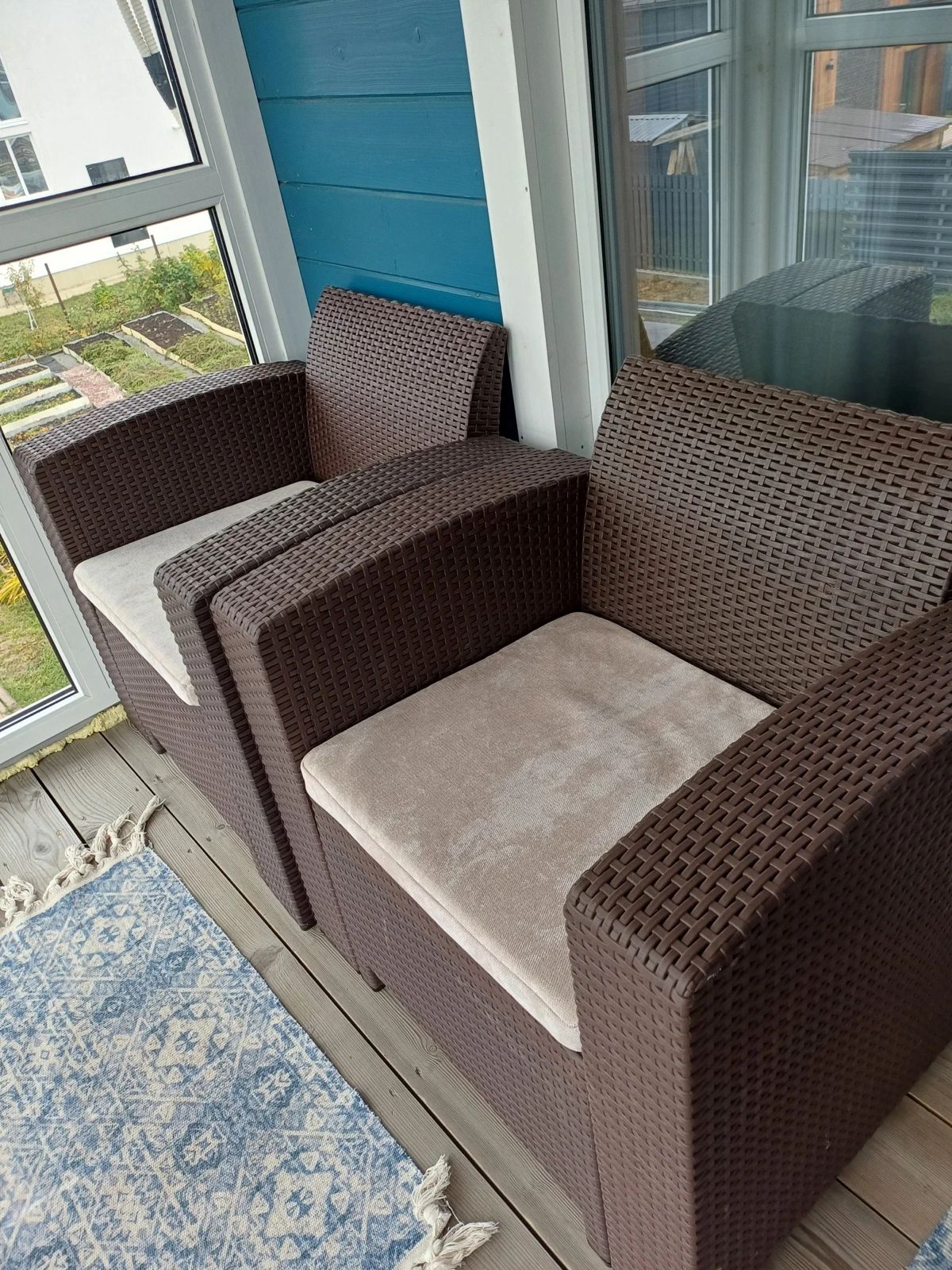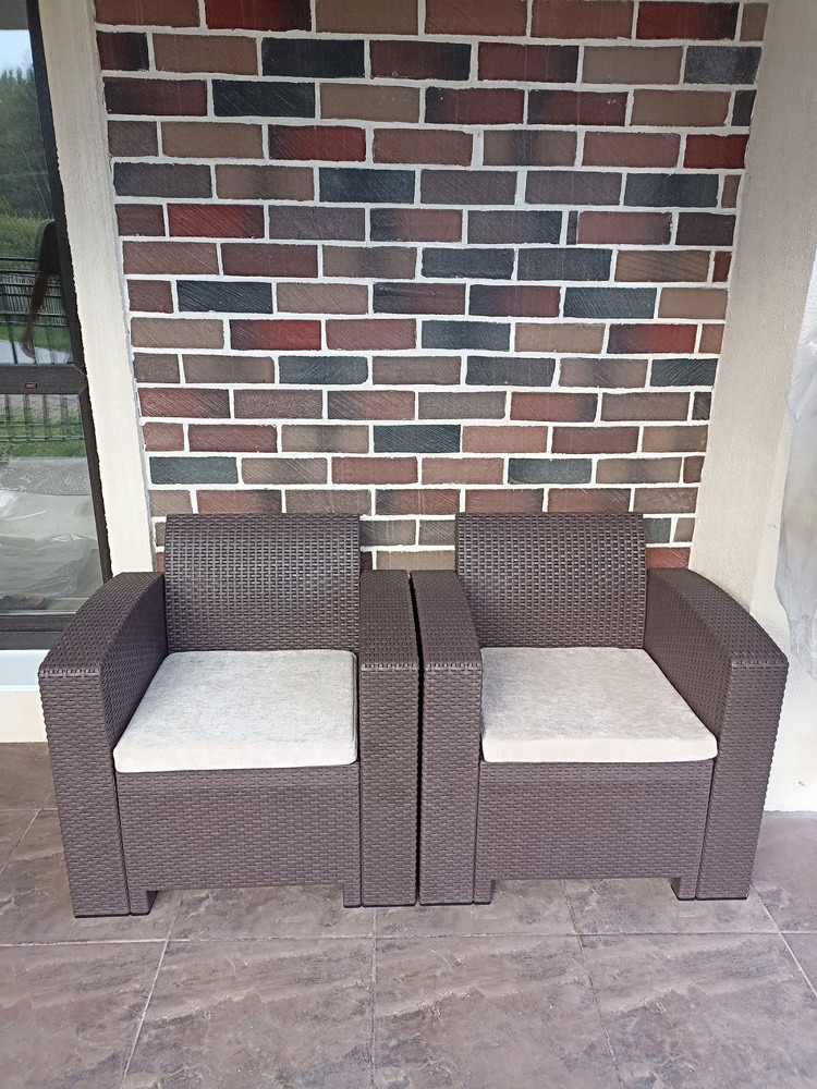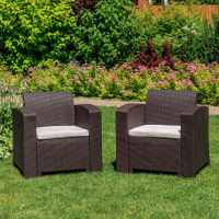 Кресла выполнены из прочного пластика с плетёной текстурой, устойчивой к влаге, солнечным лучам и перепадам температур. Они не требуют особого ухода и отлично подходят для круглогодичного использования на улице.