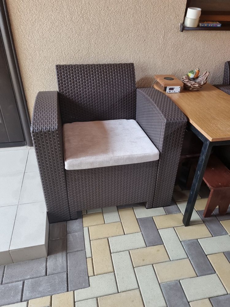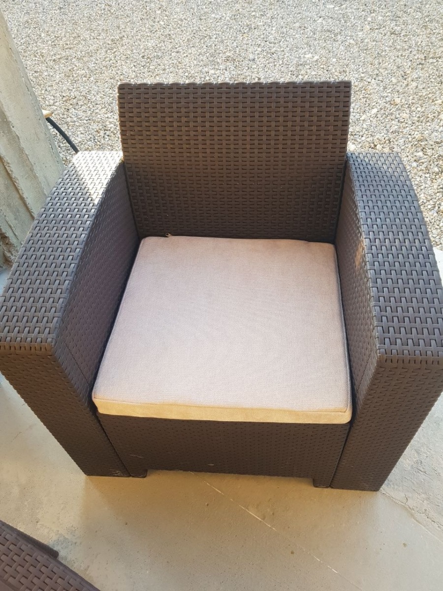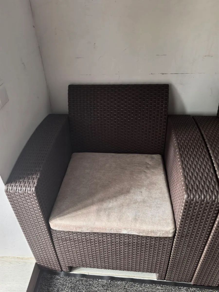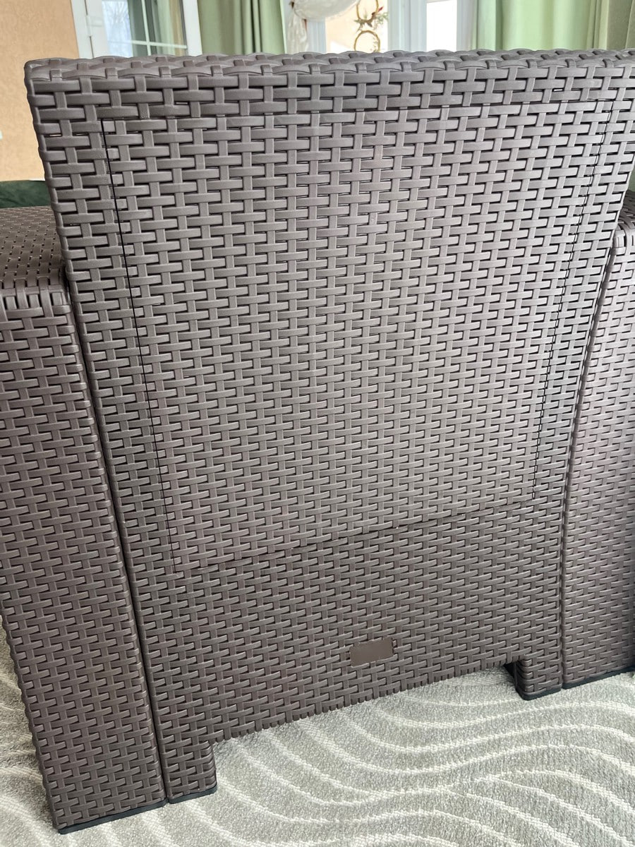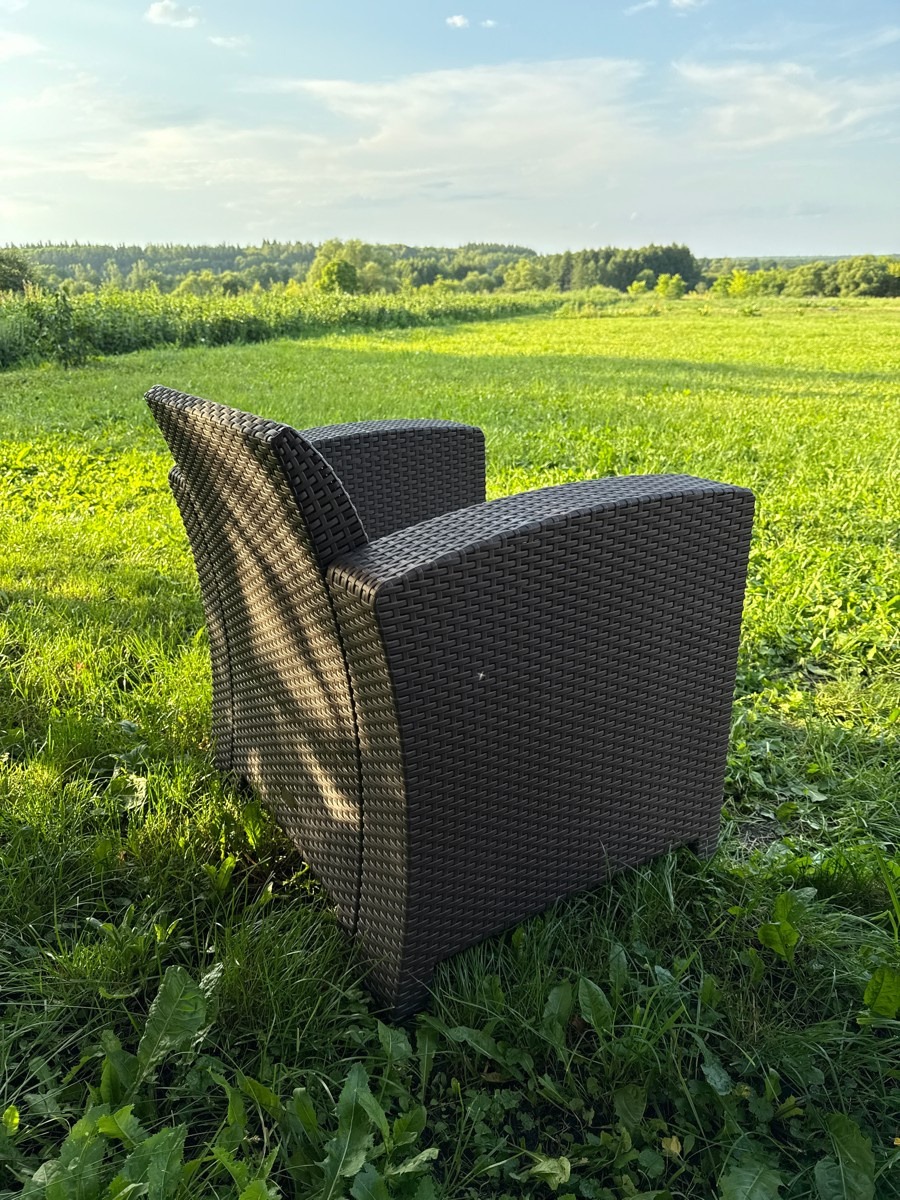 Кресла выполнены из прочного пластика с плетёной текстурой, устойчивой к влаге, солнечным лучам и перепадам температур. Они не требуют особого ухода и отлично подходят для круглогодичного использования на улице.
