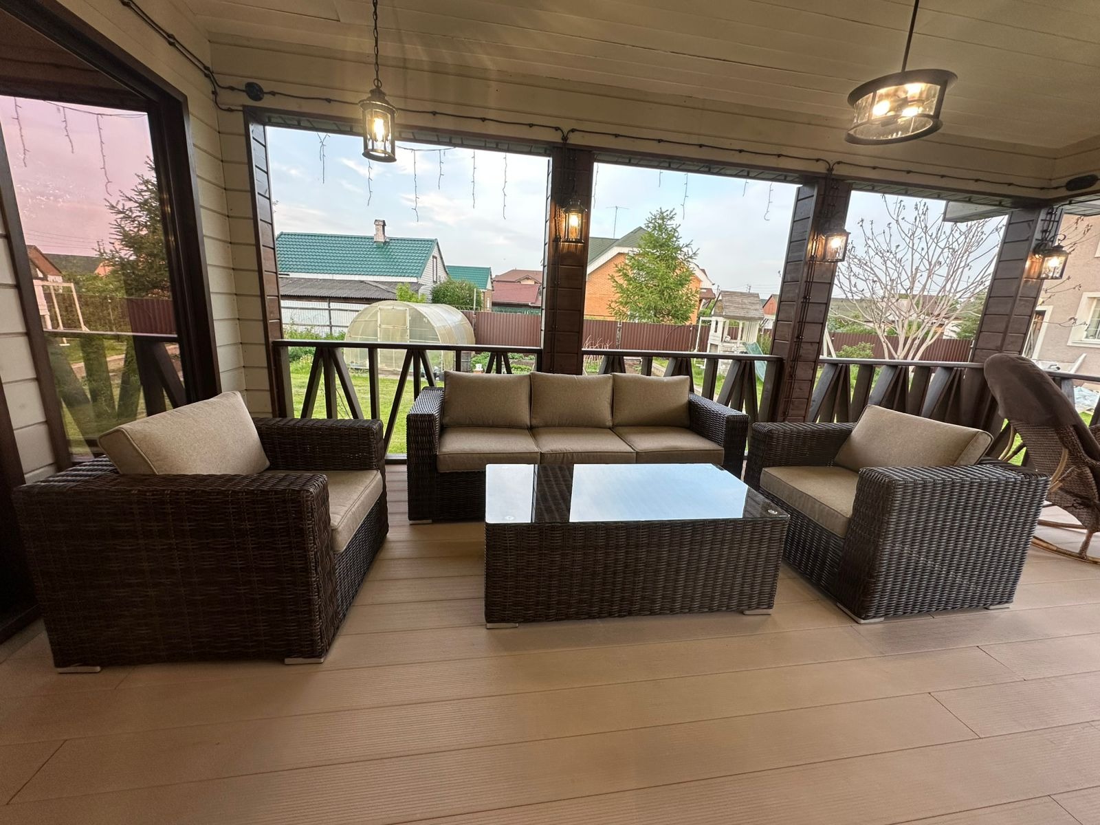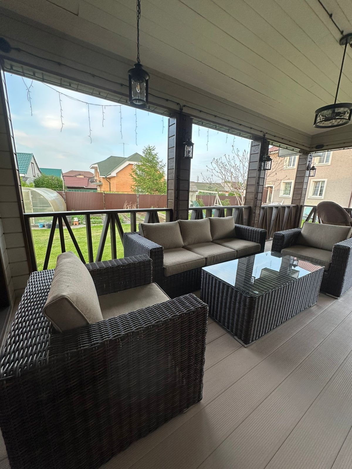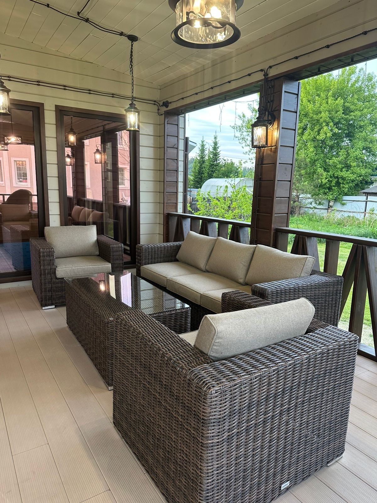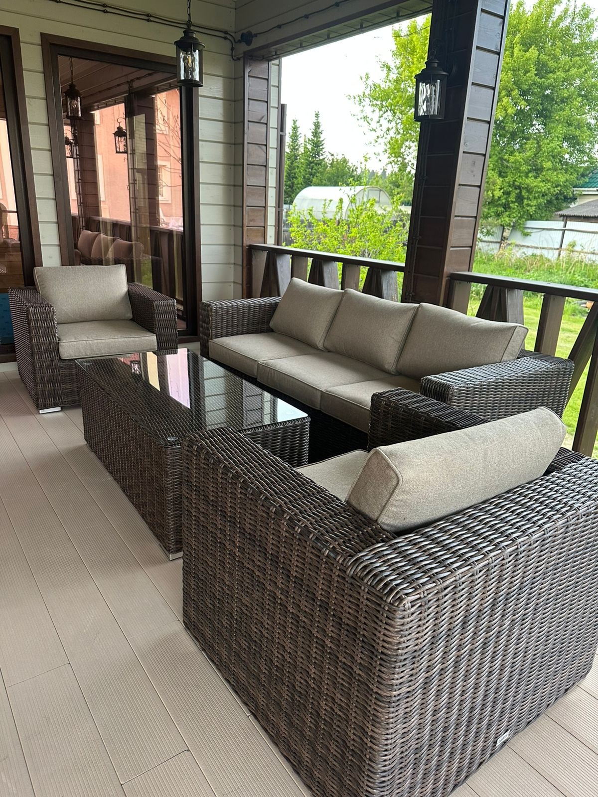 Мебель выполнена из экологичного и прочного техноротанга в коричневом цвете.