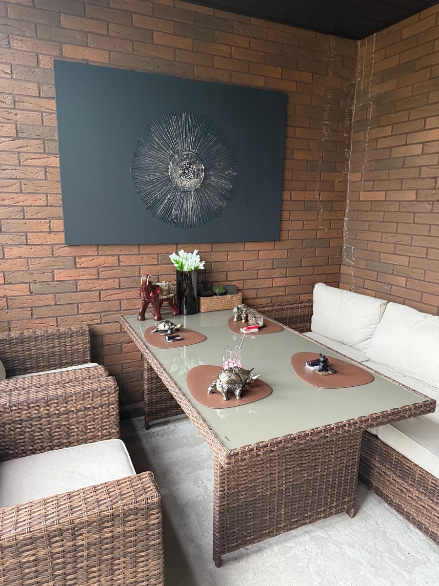 Комплект мебели KARL с обеденным столом в коричневом цвете - это элегантное и удобное решение для вашей столовой или гостиной. Он состоит из трехместного дивана, двух кресел и обеденного стола, изготовленных из искусственного ротанга на металлическом каркасе.