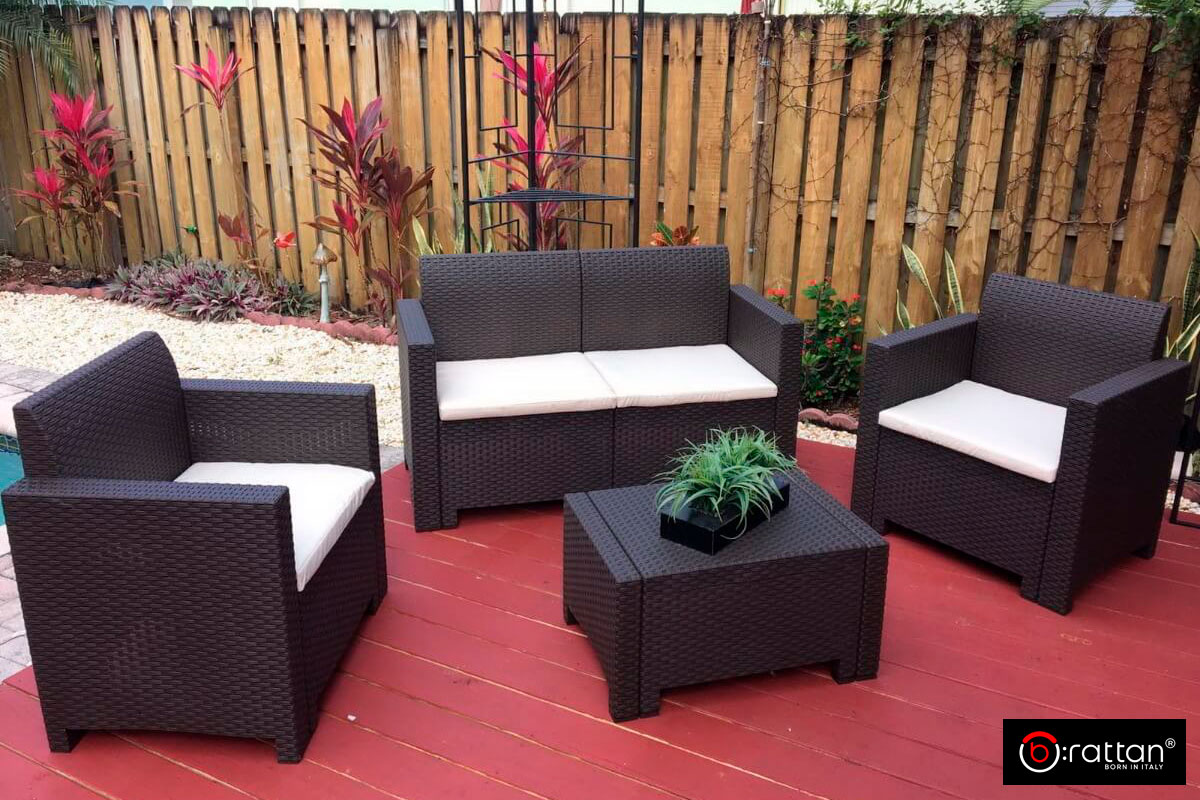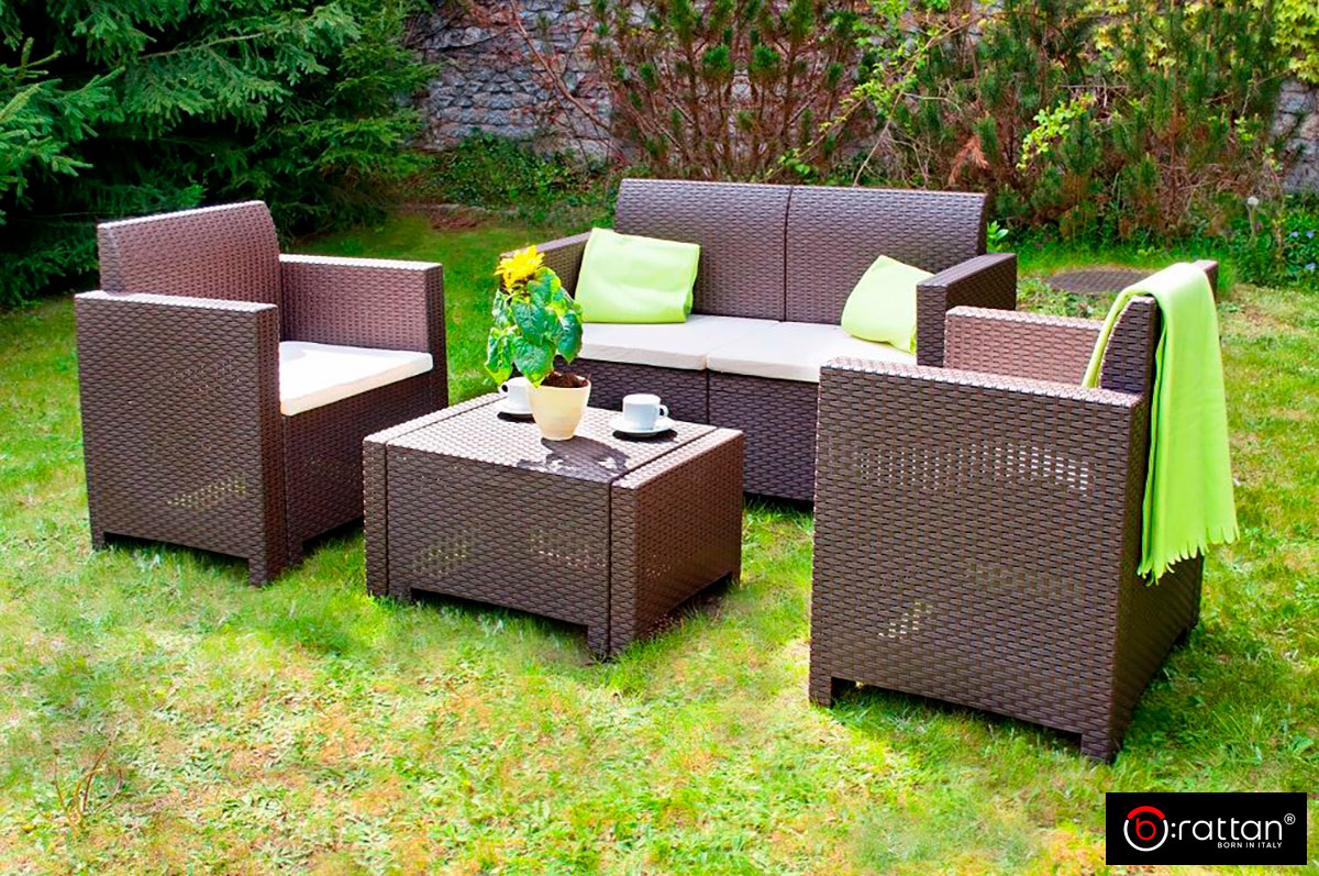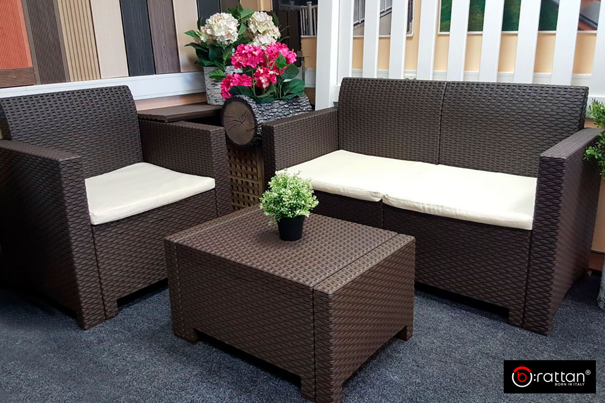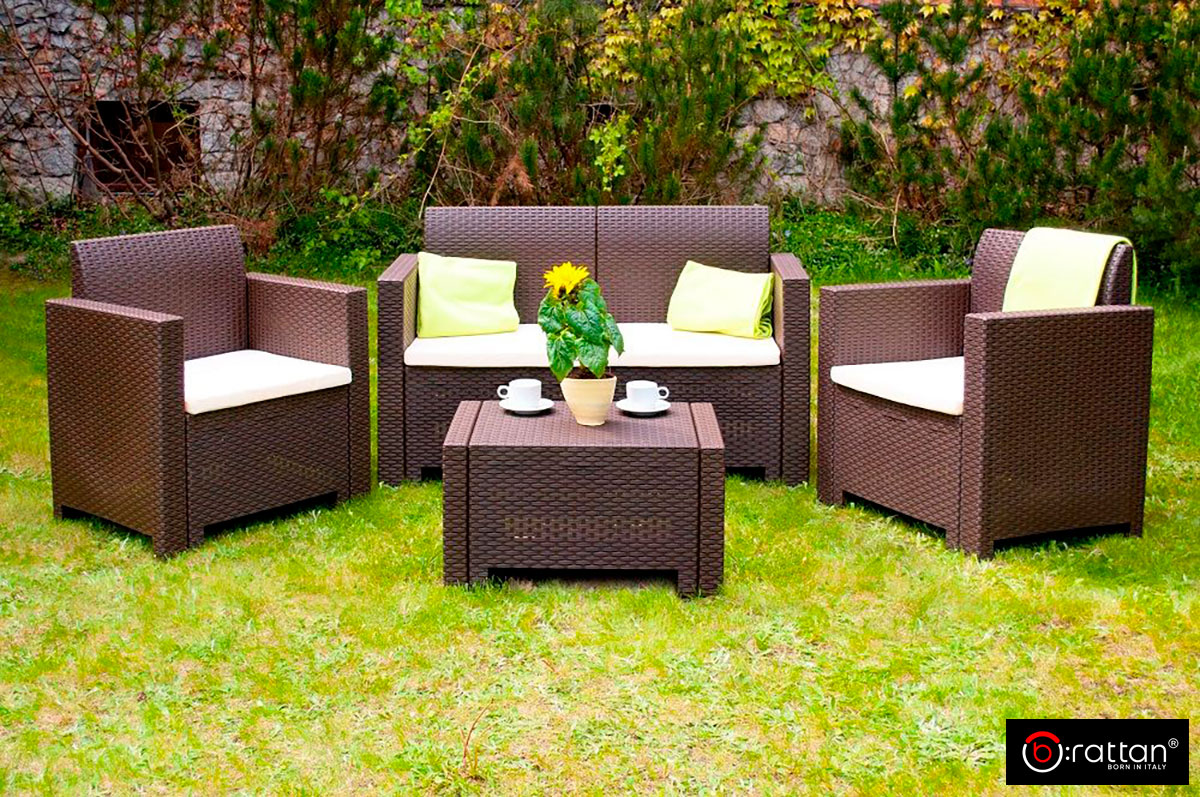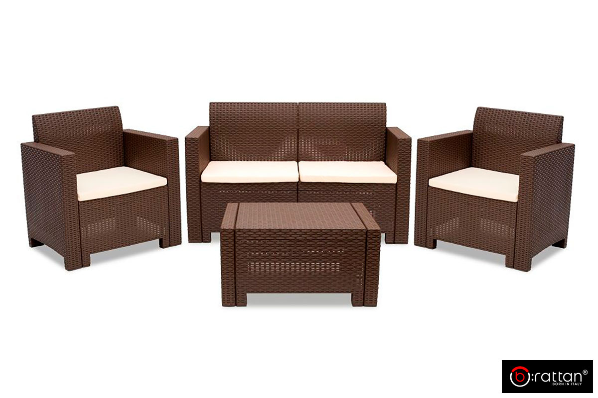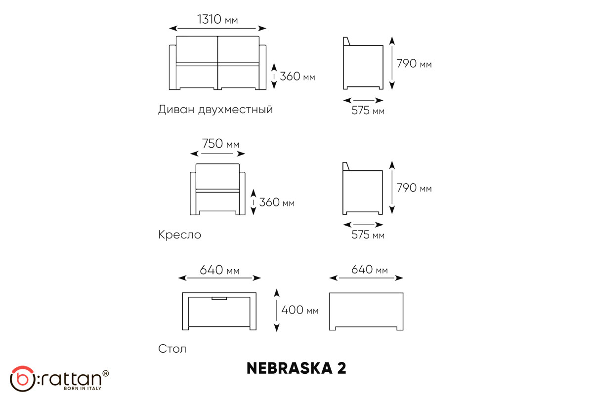 Стильная итальянская мебель для кафе, ресторанов и отелей Nebraska Set 2 от итальянского производителя B:Rattan рассчитан на 4 персоны и включает 4 предмета: 2х-местный диван, 2 кресла и кофейный столик. Пластиковый комплект порадует любителей плетеной мебели своей фактурой в стиле ротанг и прочностью: максимальная нагрузка на кресло и диван — до 160 кг.