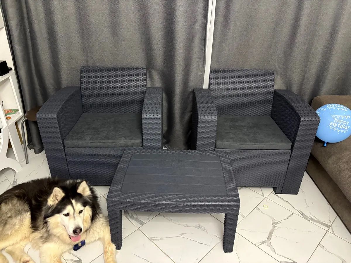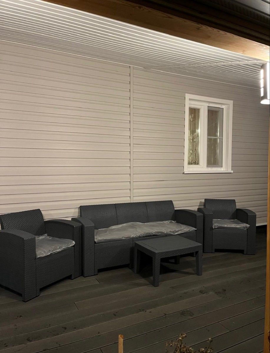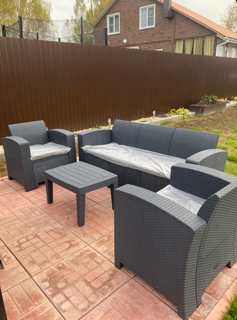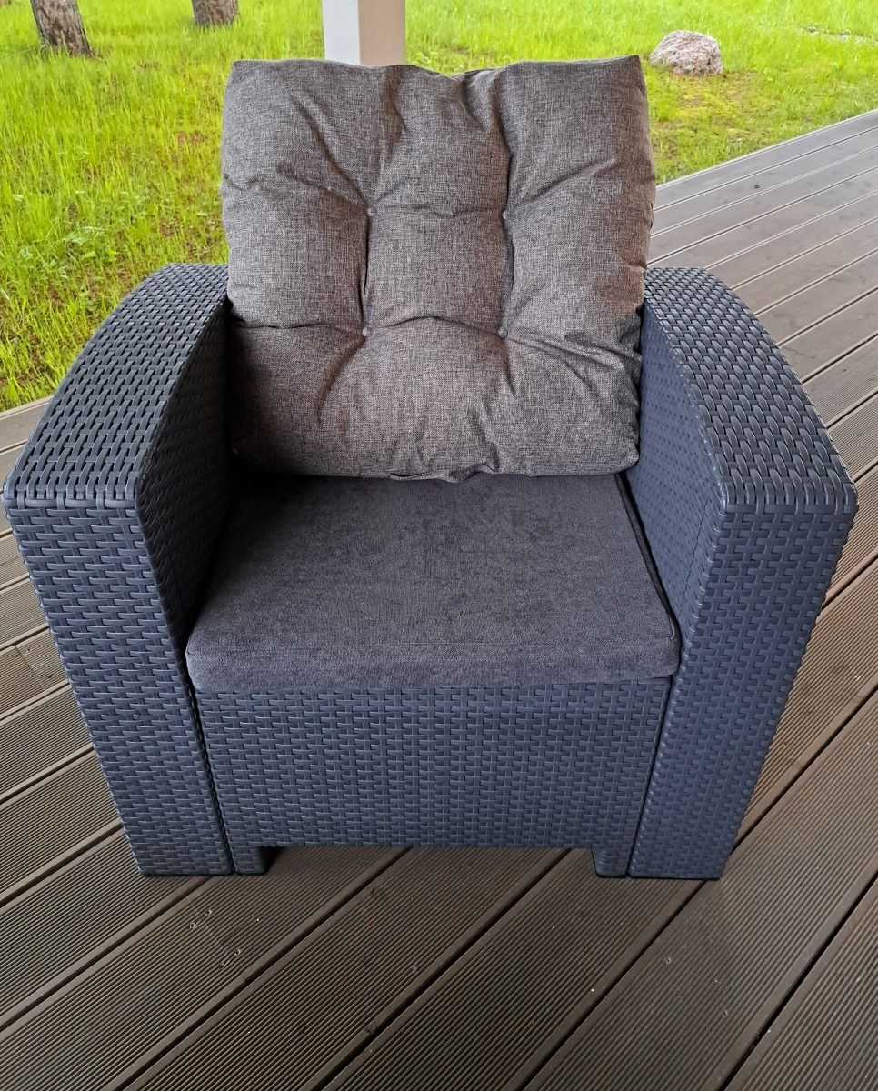 - Комфорт и стиль — глубокие кресла, мягкие подушки с чехлами из полиэстера, элегантный графит — подходящий фон для разговоров, кино под звёздами или ледяного лимонада в руках.