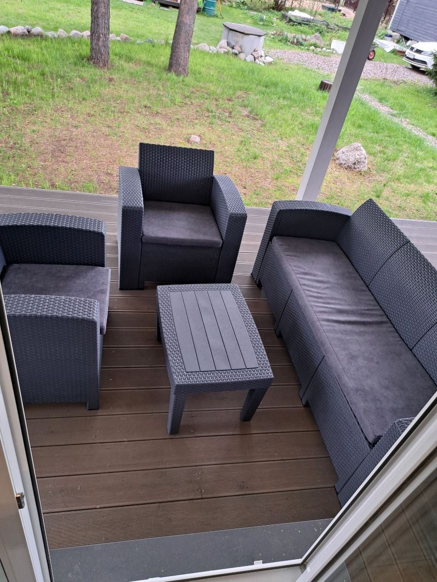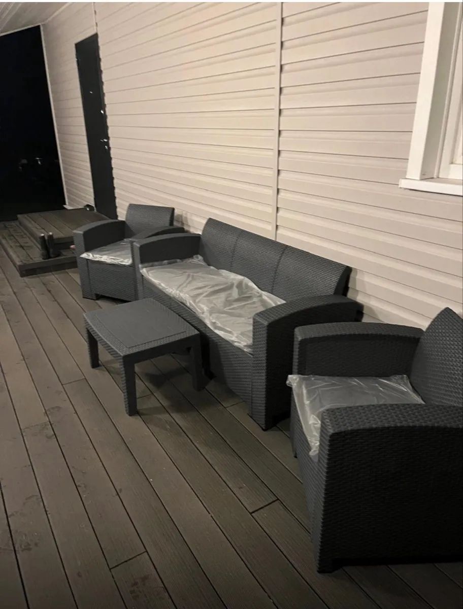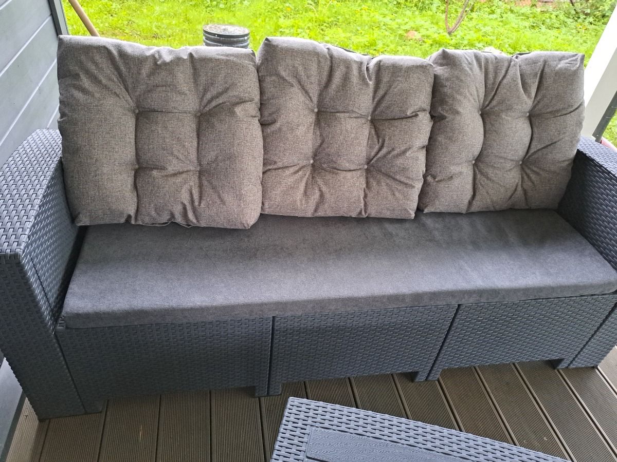 - Комфорт и стиль — глубокие кресла, мягкие подушки с чехлами из полиэстера, элегантный графит — подходящий фон для разговоров, кино под звёздами или ледяного лимонада в руках.