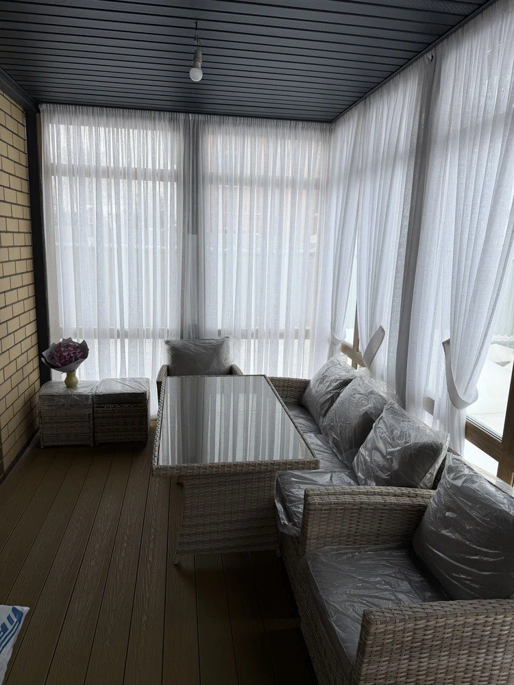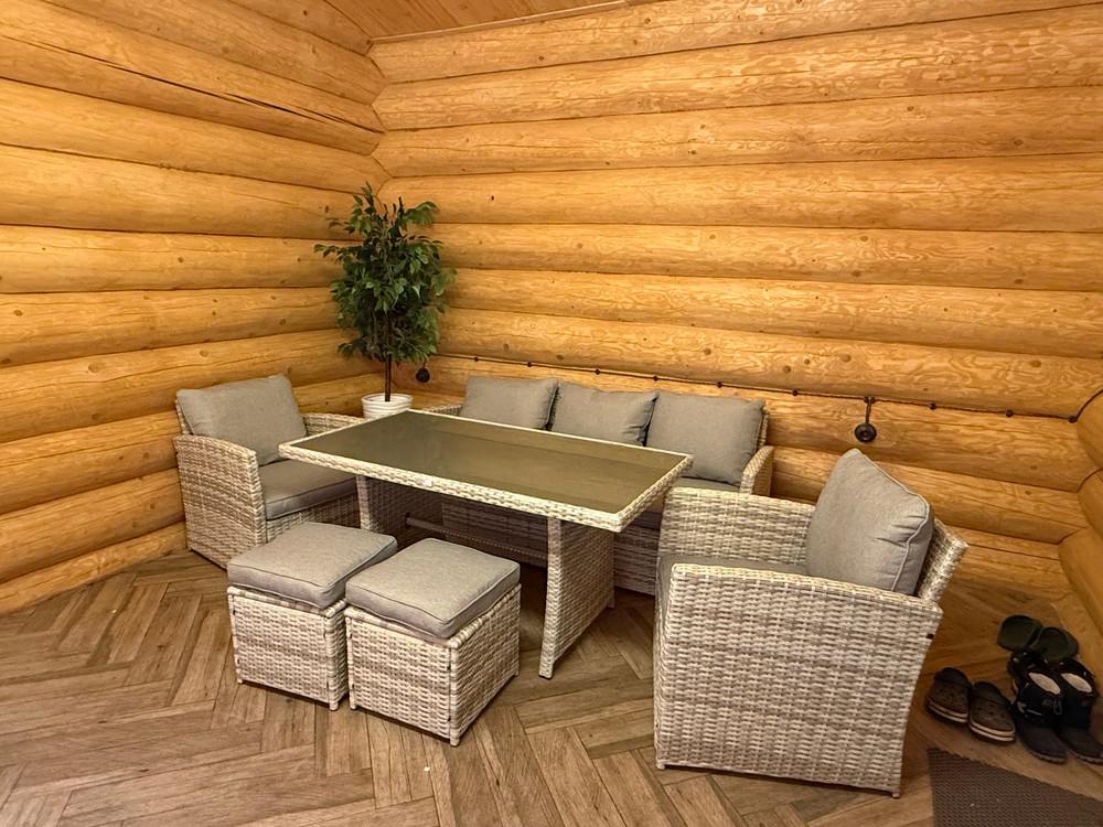 Представленный комплект мебели из ротанга для дачи состоит из нескольких элементов. Главную роль играет диван для трех человек. Покупатель получает также обеденный стол с парой кресел и пуфов. У хозяйки коттеджа будет больше гибкости при планировании расстановки предметов интерьера на улице. Их можно использовать вместе или разместить по большой опоясывающей веранде, создав единую композицию.