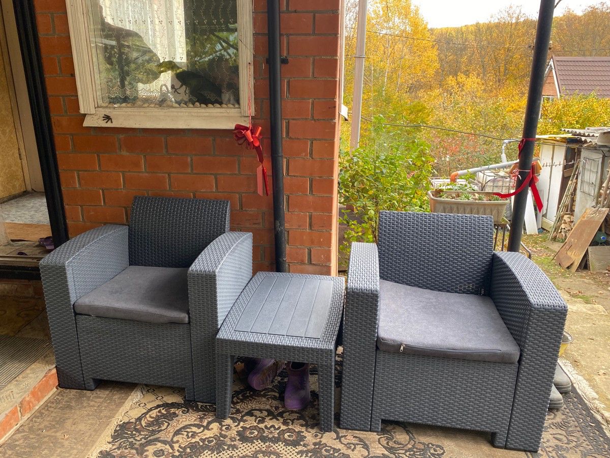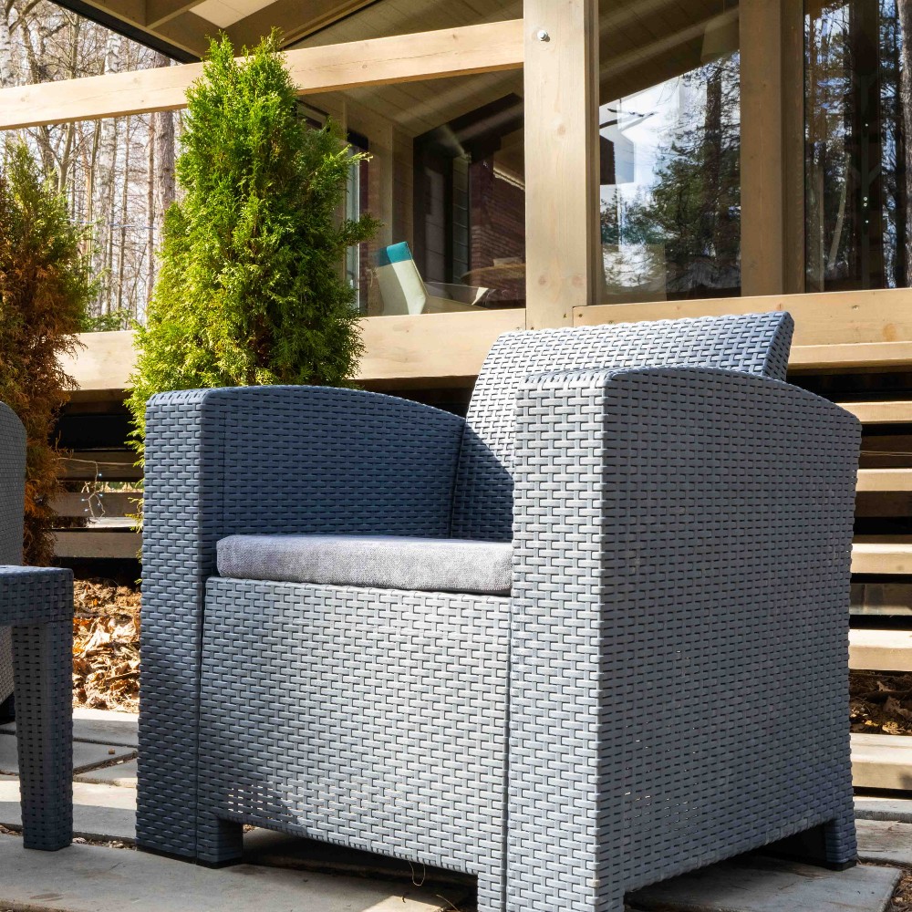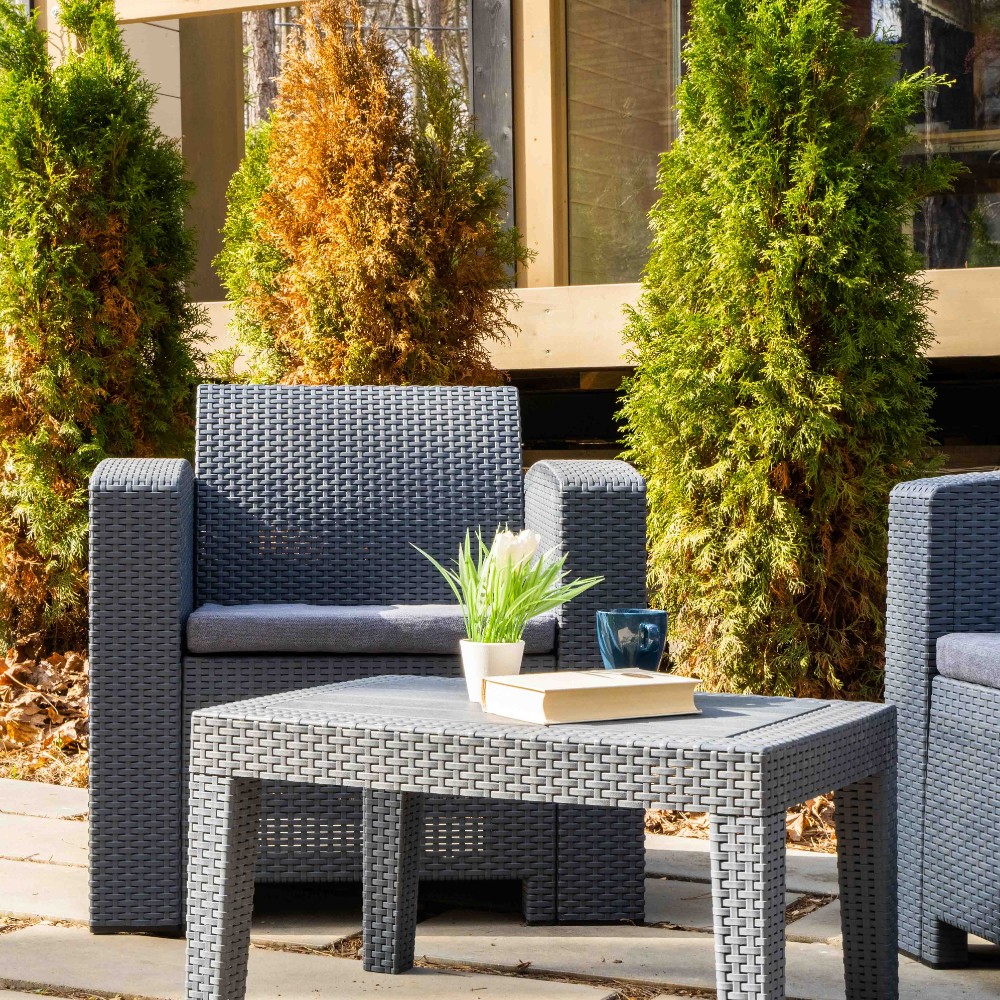 Прочный пластик с матовой текстурой имитирует ротанг, но гораздо практичнее: не выгорает на солнце, не боится дождя, не требует ухода. Мебель можно спокойно оставить на улице — она выдержит любые капризы погоды.