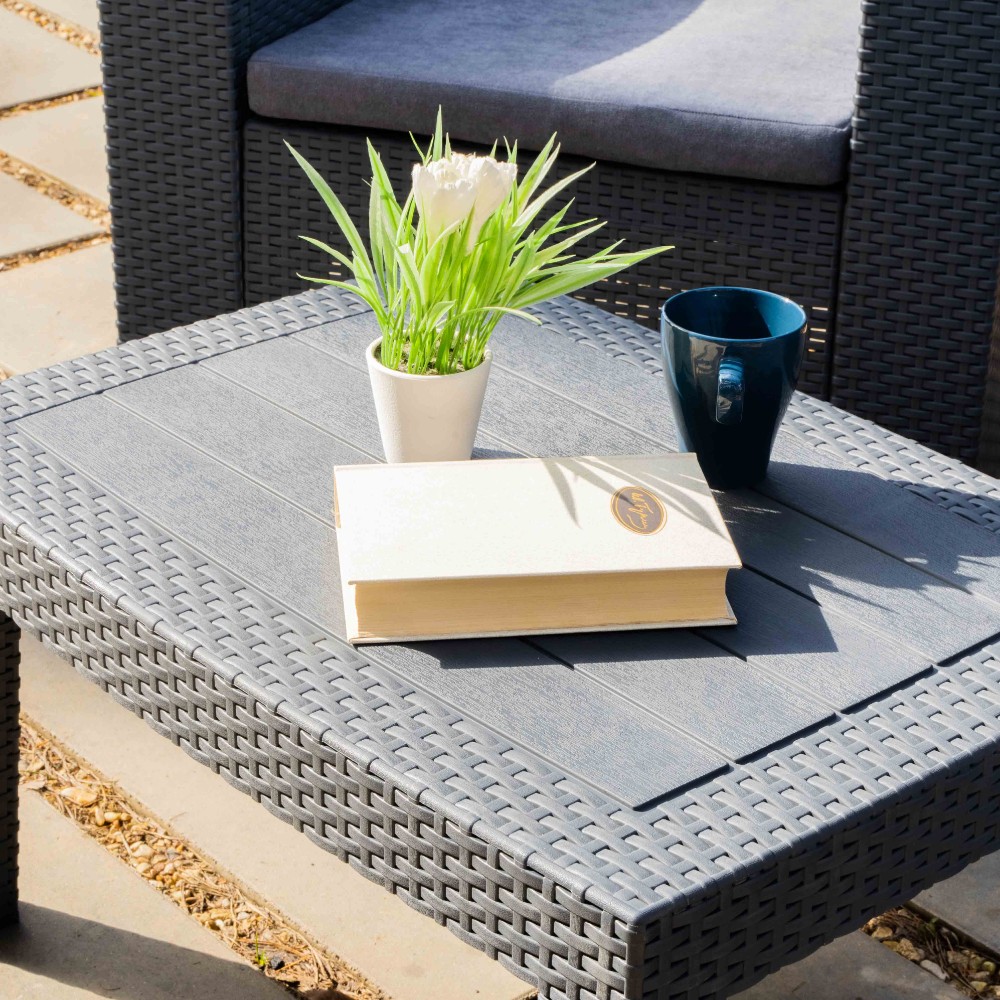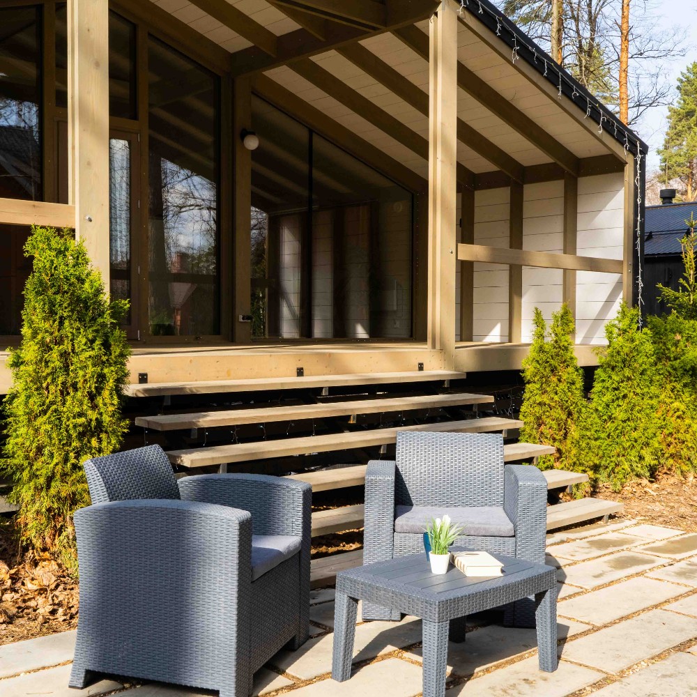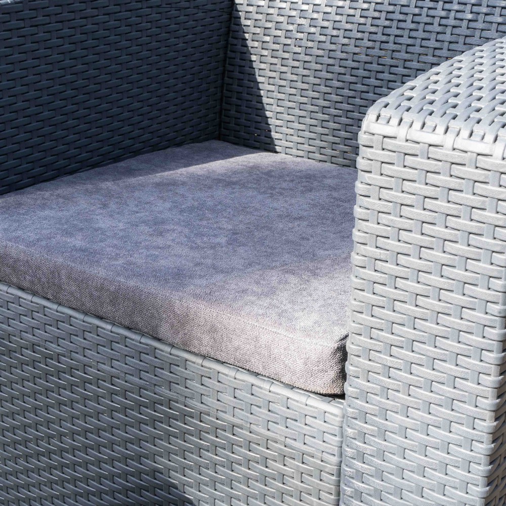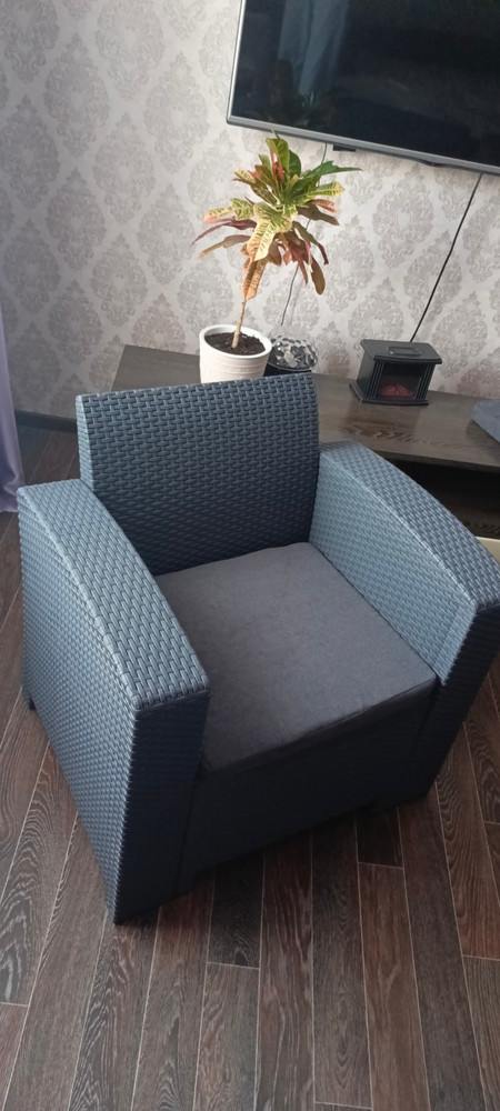 Прочный пластик с матовой текстурой имитирует ротанг, но гораздо практичнее: не выгорает на солнце, не боится дождя, не требует ухода. Мебель можно спокойно оставить на улице — она выдержит любые капризы погоды.
