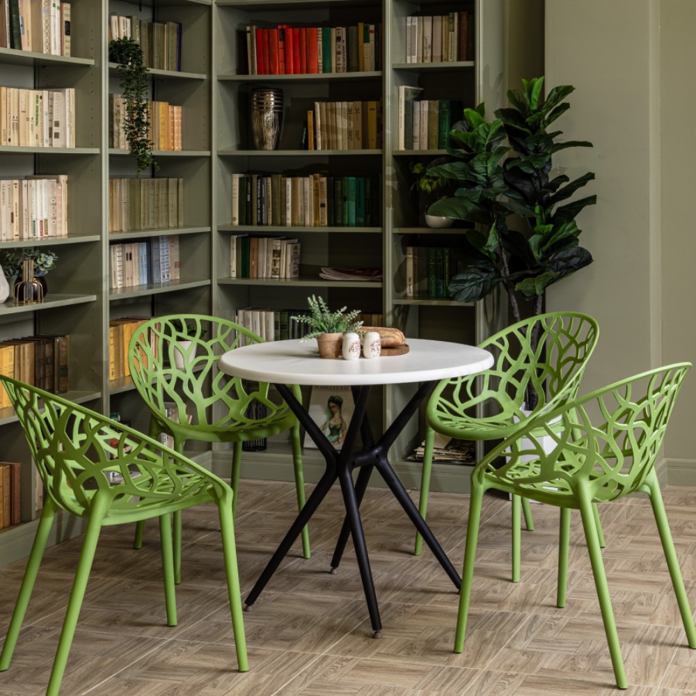 Стол Royal Family Tom выполнен из прочного пластика и устойчив к влаге, солнцу и перепадам температур. Бело-чёрная расцветка добавляет графичности и делает его универсальной основой для любых сочетаний. Стулья Aria в мятном оттенке добавляют яркости, не перегружая пространство, и при этом сохраняют удобство: эргономичная форма, лёгкий вес и возможность штабелировать.