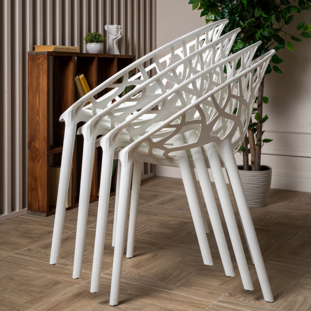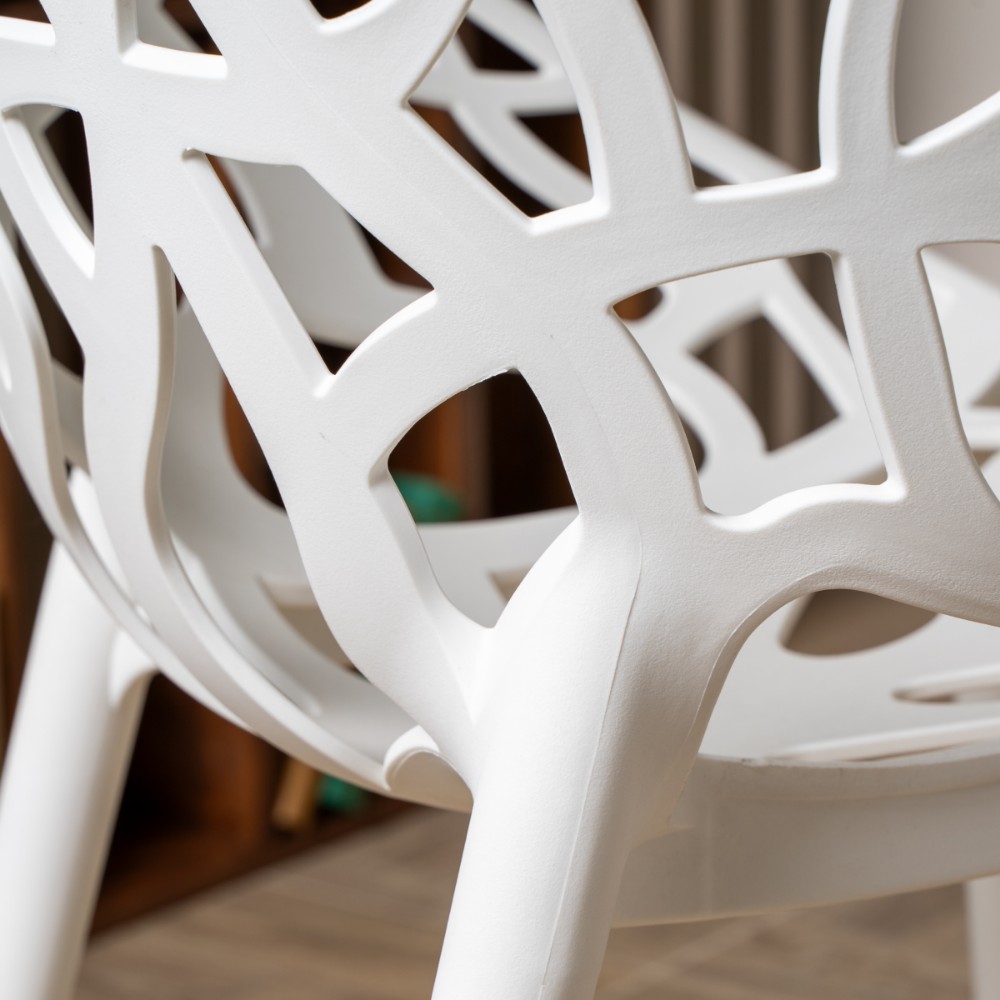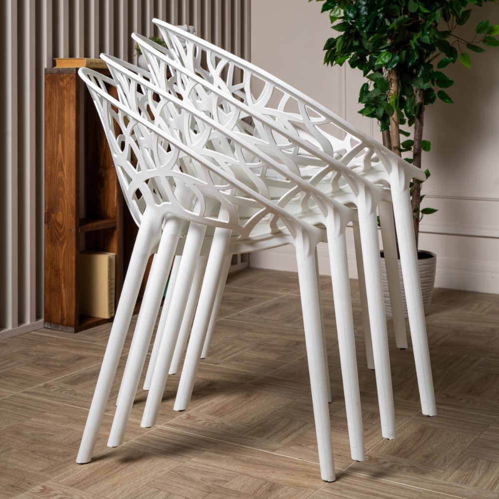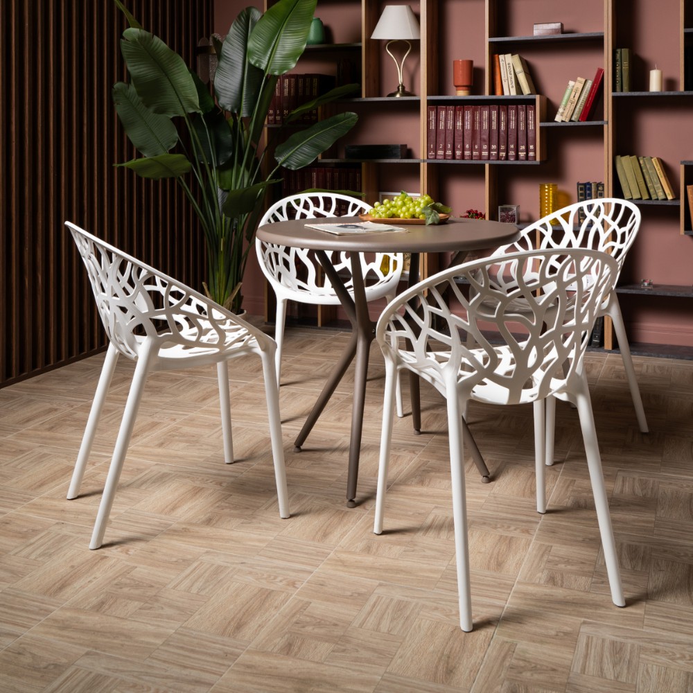 Стол Royal Family Tom выполнен из прочного пластика, устойчивого к влаге, солнцу и перепадам температур. Он не выцветает, не боится уличных условий и легко очищается. Белые стулья Aria удобны, эргономичны, лёгкие по весу и штабелируются — это особенно удобно при сезонном хранении или коммерческом использовании.