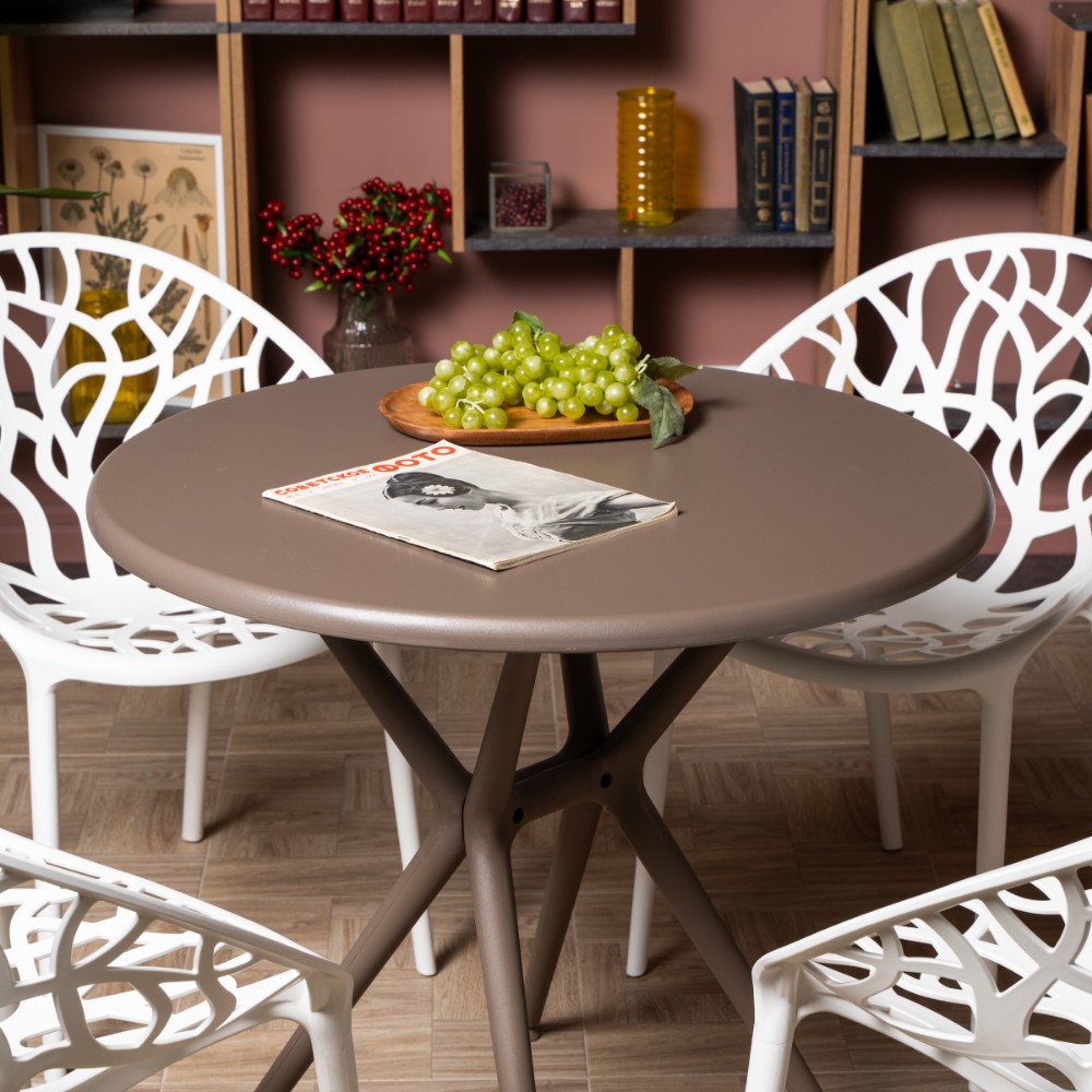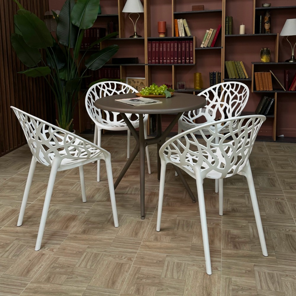 Комплект Tom + Aria — это готовое решение для уютной обеденной зоны на даче, террасе, балконе или в летнем кафе. Тёплый оттенок стола капучино и лёгкие белые стулья создают мягкий, нейтральный образ, который легко впишется в любой интерьер под открытым небом.