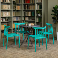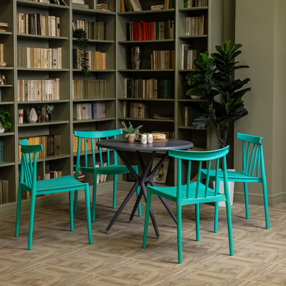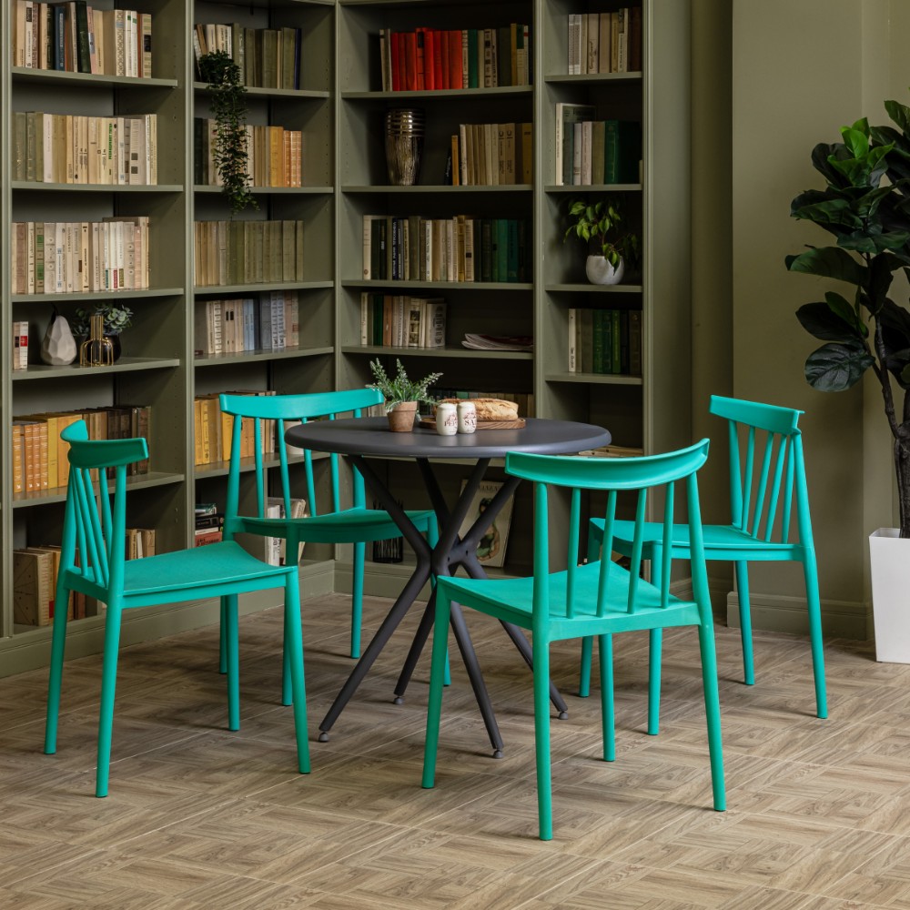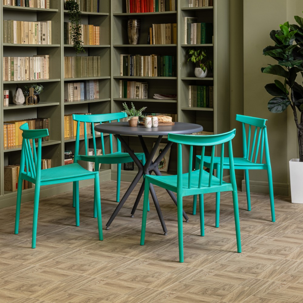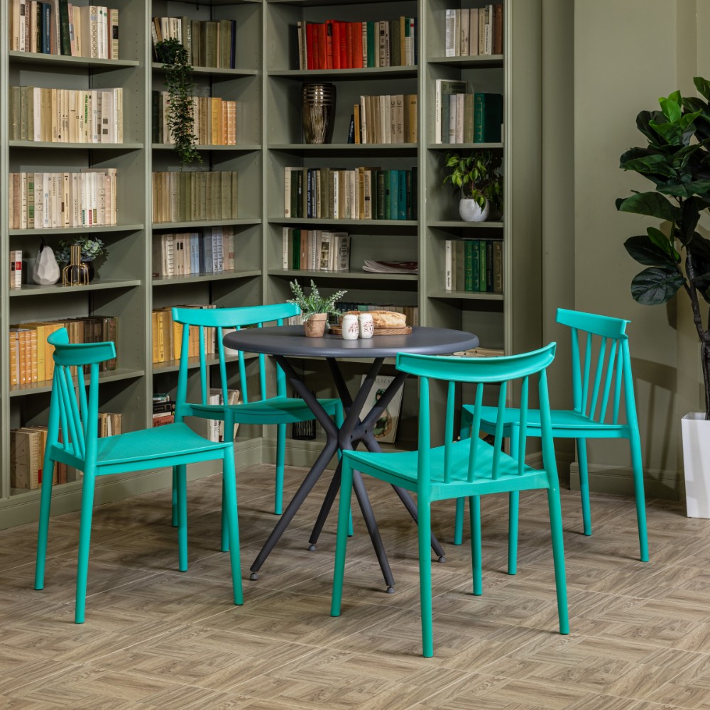 Цвет тиффани добавляет яркий акцент, а нейтральный серый стол делает композицию сбалансированной и универсальной. Комплект не требует ухода и отлично чувствует себя как в частных, так и в коммерческих пространствах.