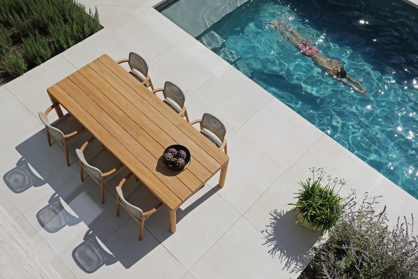 Алюминиевый каркас спинки сиденья кресла, ножки из тикового дерева FSC + олефиновая веревка, подушка на сиденье с наполнителем из быстросохнущей пены, солнцезащитная ткань.