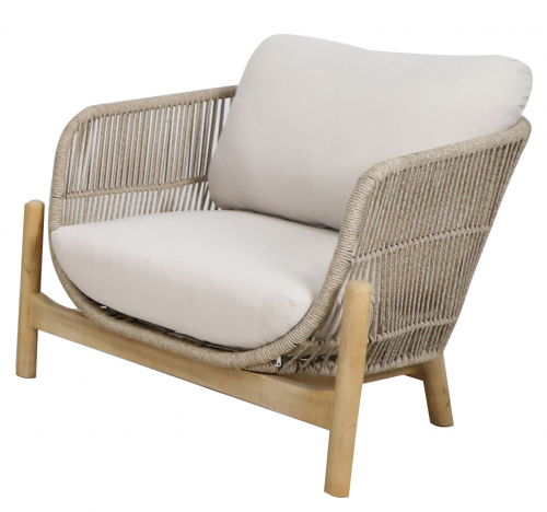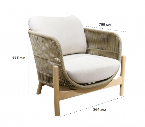 - Веревочное плетение роуп толщиной 6 мм на спинке и подлокотниках излучает стиль в сочетании с деревянными поверхностями. Цвет плетения: бежевый.